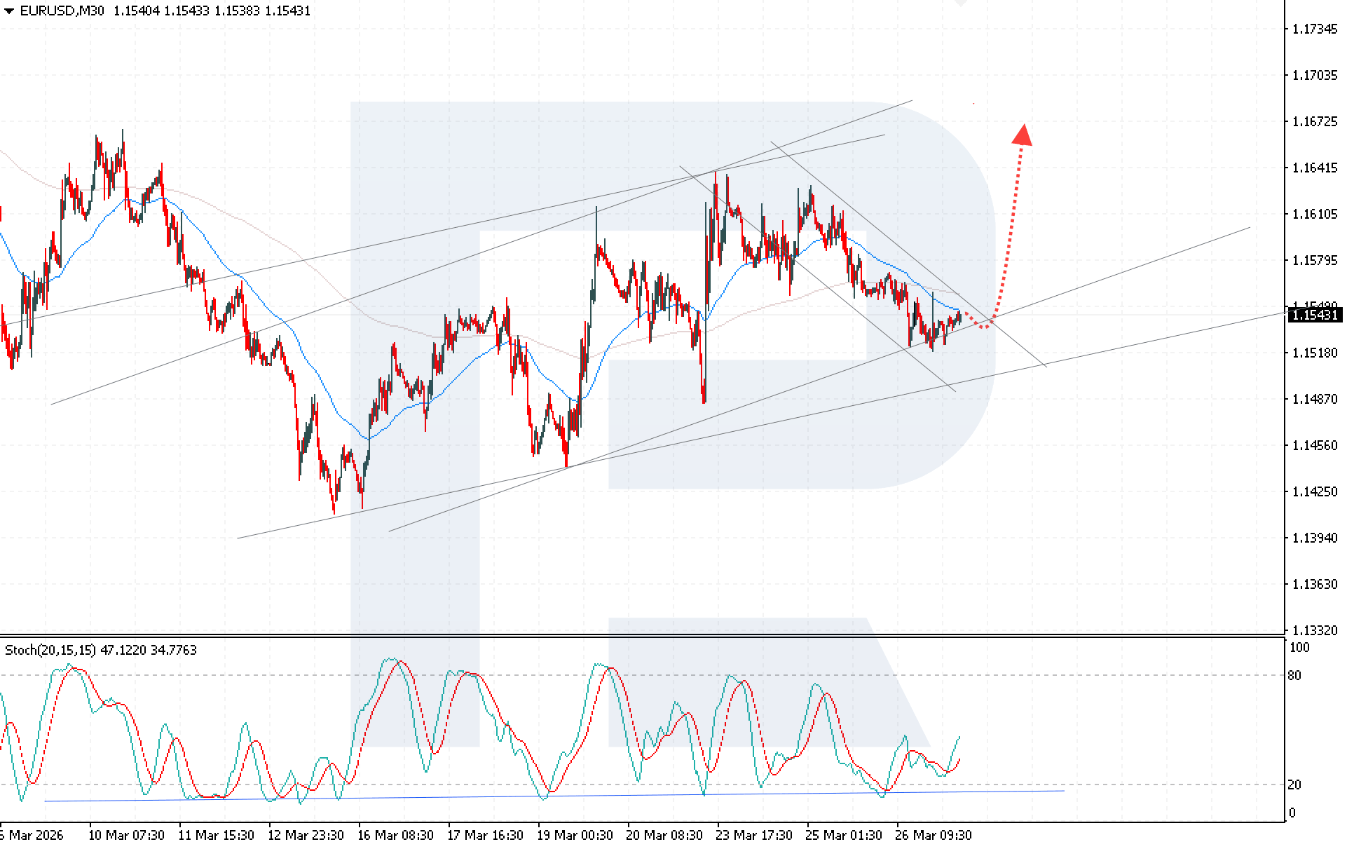 The EURUSD rate is stabilising after a corrective decline amid revised expectations for Federal Reserve monetary policy. The rate currently stands at 1.1543. Discover more in our analysis for 27 March 2026.