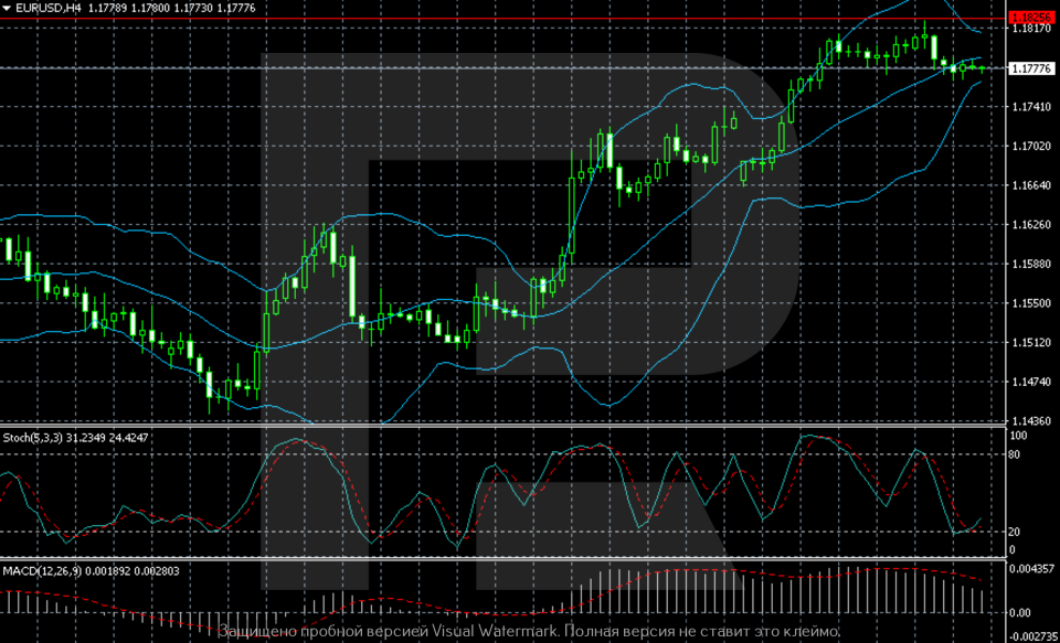 The EURUSD H4 chart shows that the upward structure remains in place after the reversal from the lows. The price is consistently forming higher highs and higher lows, moving along the middle Bollinger Band. The latest upward impulse brought quotes into the 1.18+ area, where the market started to slow and move into a local consolidation phase.