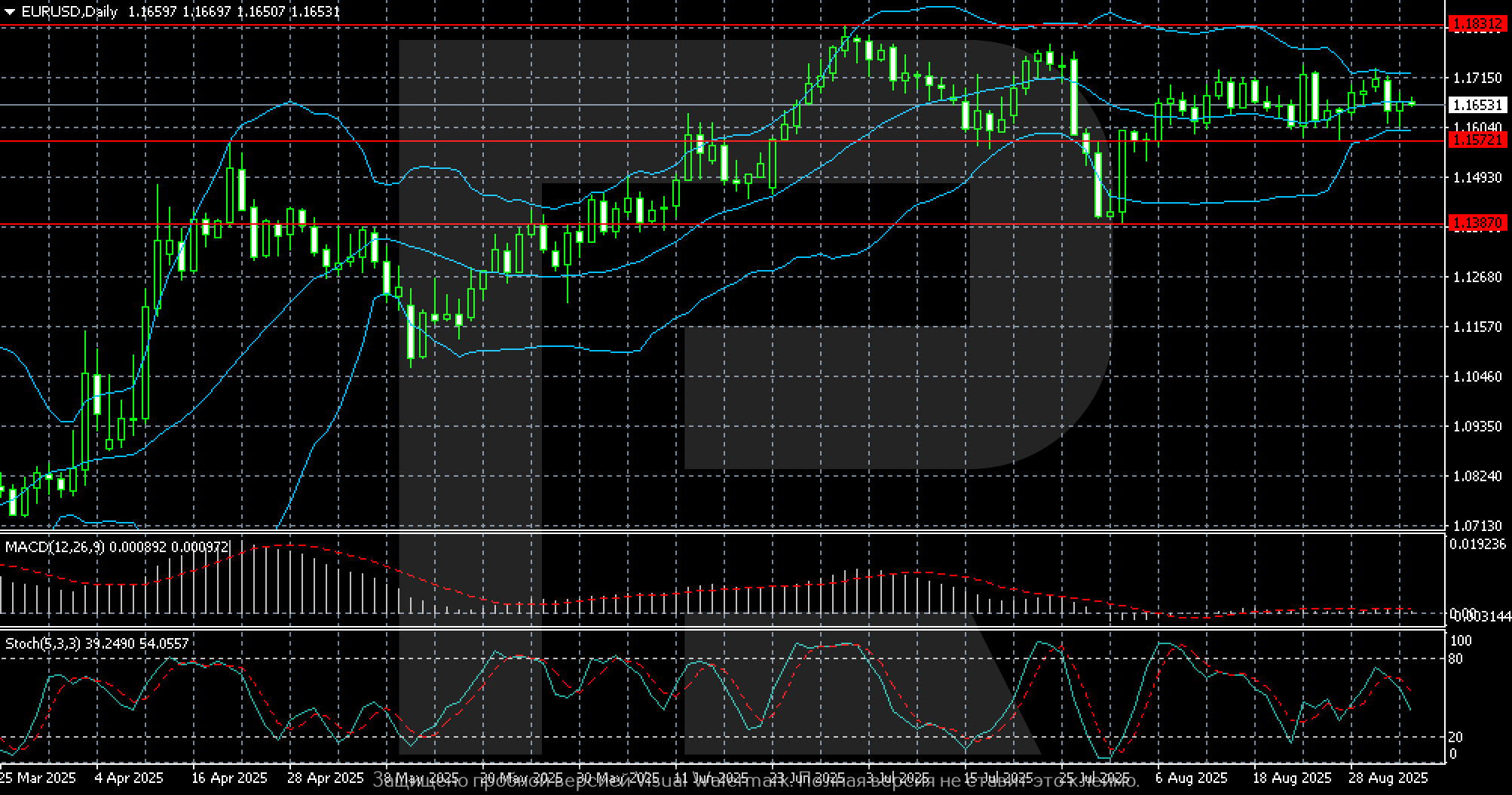 MACD remains near the zero line, indicating trend weakness and the lack of a strong impulse. The Stochastic oscillates in the mid-range, confirming neutral sentiment.