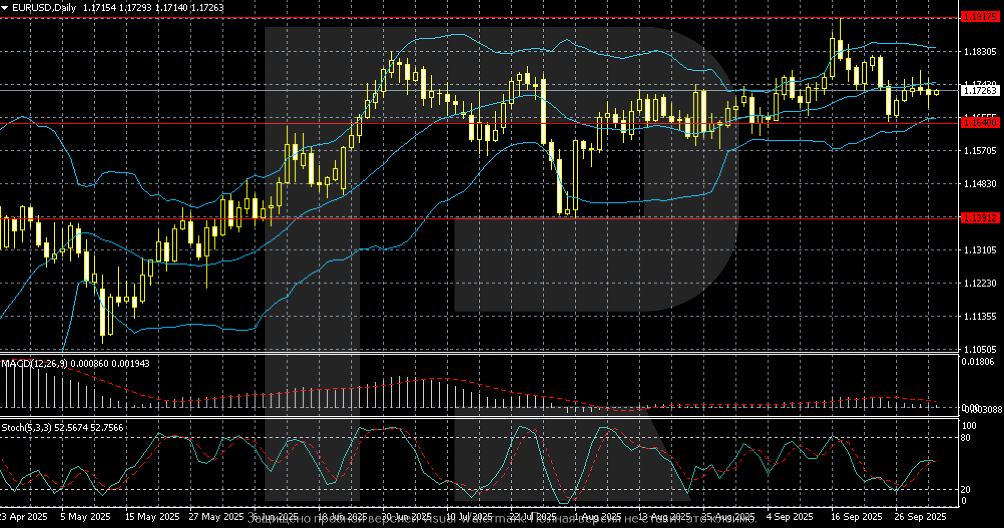Technically, the pair consolidates within the 1.1640–1.1780 range. It is trading near the centre of the corridor, with MACD and Stochastic signals remaining neutral, and narrowing Bollinger Bands pointing to lower volatility. The fundamental backdrop limits upside: the US shutdown and data delays increase uncertainty, but the dollar maintains demand as a safe-haven asset. Federal Reserve rate decisions and fresh inflation data remain the main drivers.