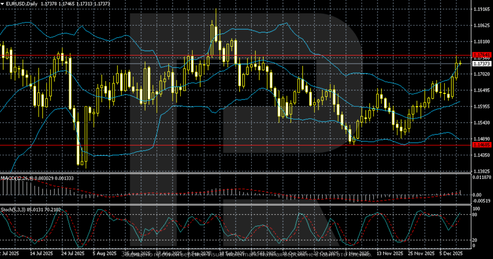 Despite the recovery, EURUSD remains within a broad range of 1.1485–1.1754, approaching the upper boundary. This outlook reviews the key factors likely to shape the pair’s dynamics during the week of 15–19 December 2025.