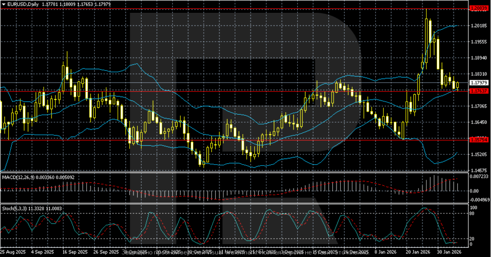 Technically, the EURUSD pair remains in a correction phase within an uptrend. Following the January rally towards 1.2000–1.2050, the pair is consolidating in the 1.1760–1.1800 zone, a key support area. The price is holding near the middle Bollinger Band, and volatility is falling. MACD remains in positive territory, while the Stochastic Oscillator confirms a pause without reversal signals.