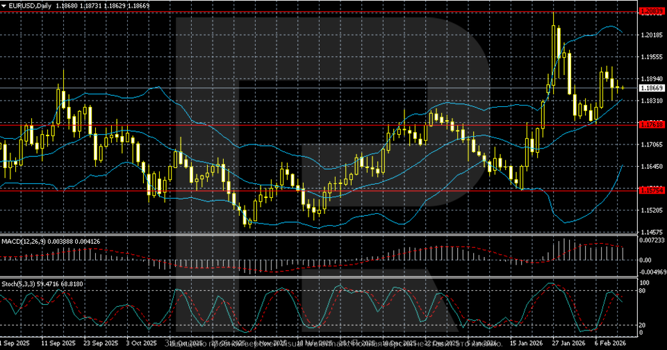 On the daily timeframe, the EURUSD pair maintains medium-term upward momentum after the January surge to 1.20+. A correction followed from the peak, but the structure of higher lows remains intact. The price is consolidating around 1.1850–1.1900, holding above the middle Bollinger Band. The bands are gradually narrowing as the market is shifting into a stabilisation phase after a volatility spike.