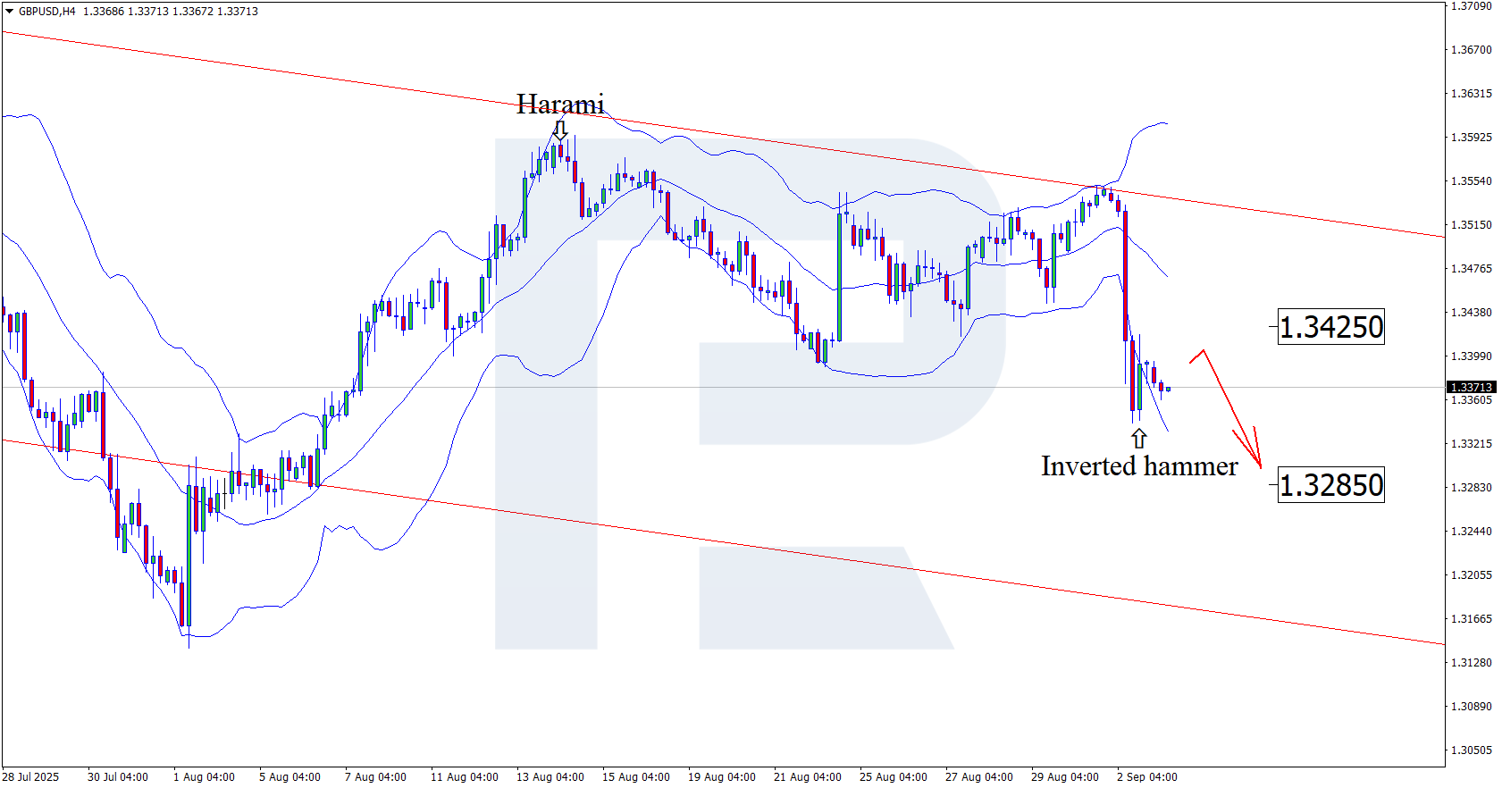 On the H4 chart, the GBPUSD pair tested the lower Bollinger Band and formed an Inverted Hammer reversal pattern. At this stage, the pair may develop a corrective wave following this signal. Given that the price is within a descending channel after a sharp drop, a corrective rebound is likely.