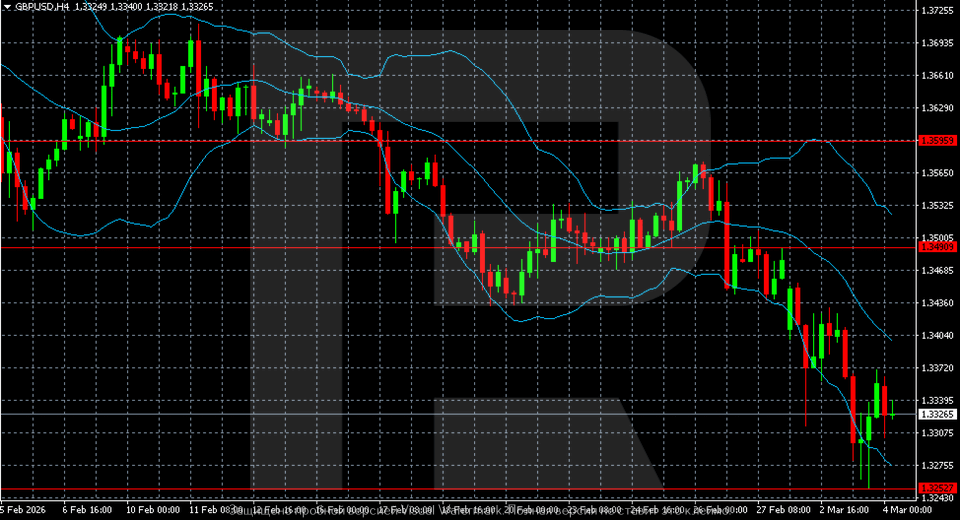 The GBPUSD pair remains under pressure due to a combination of external and domestic factors. The forecast for today, 4 March 2026, does not rule out a further decline towards 1.3253.