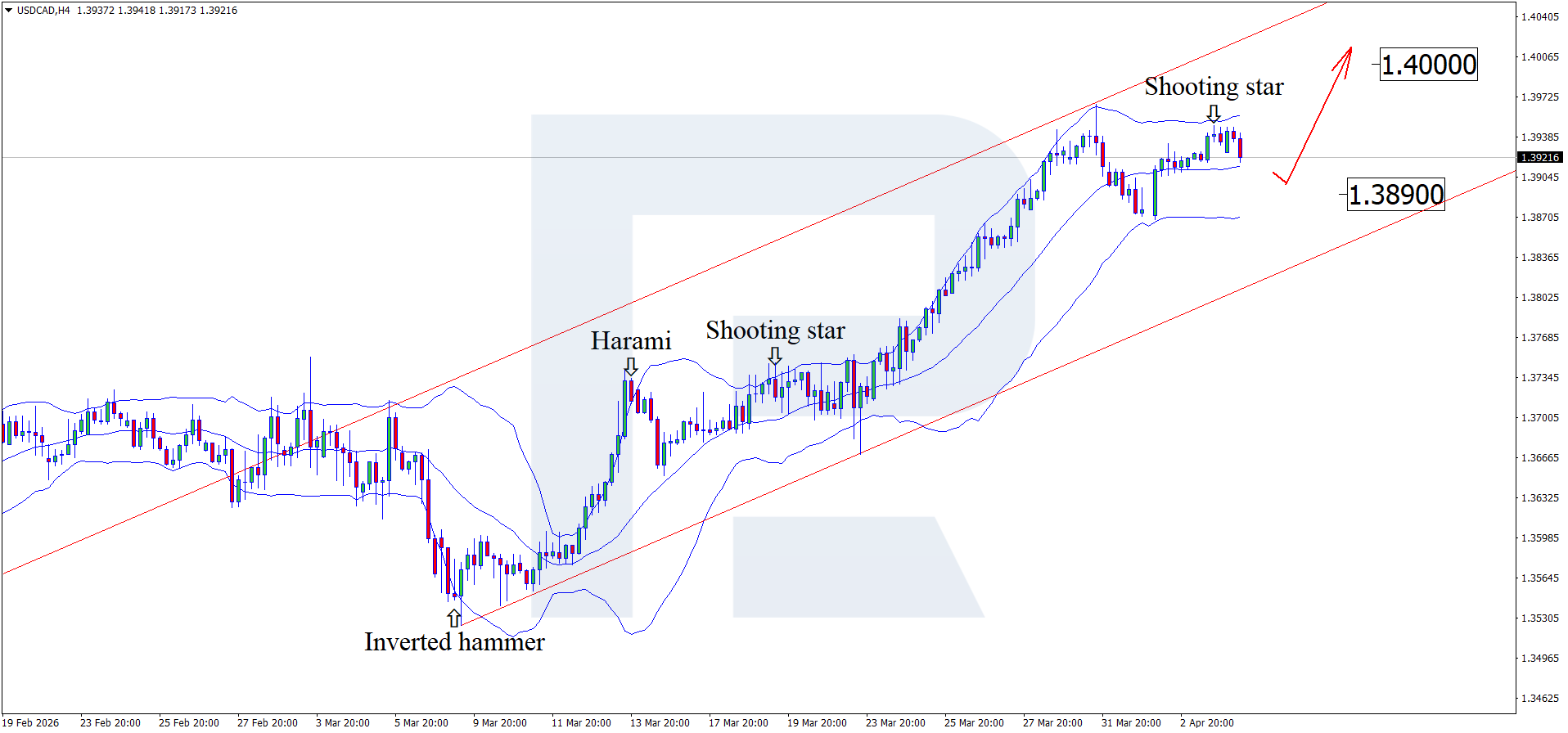 On the H4 chart, the USDCAD pair formed a Shooting Star reversal pattern near the upper Bollinger Band. At this stage, it may form a downward wave following this signal. Since quotes remain within an ascending channel, a fall towards the nearest support level at 1.3890 can be expected. A rebound from this level would open the door for continued upward momentum.