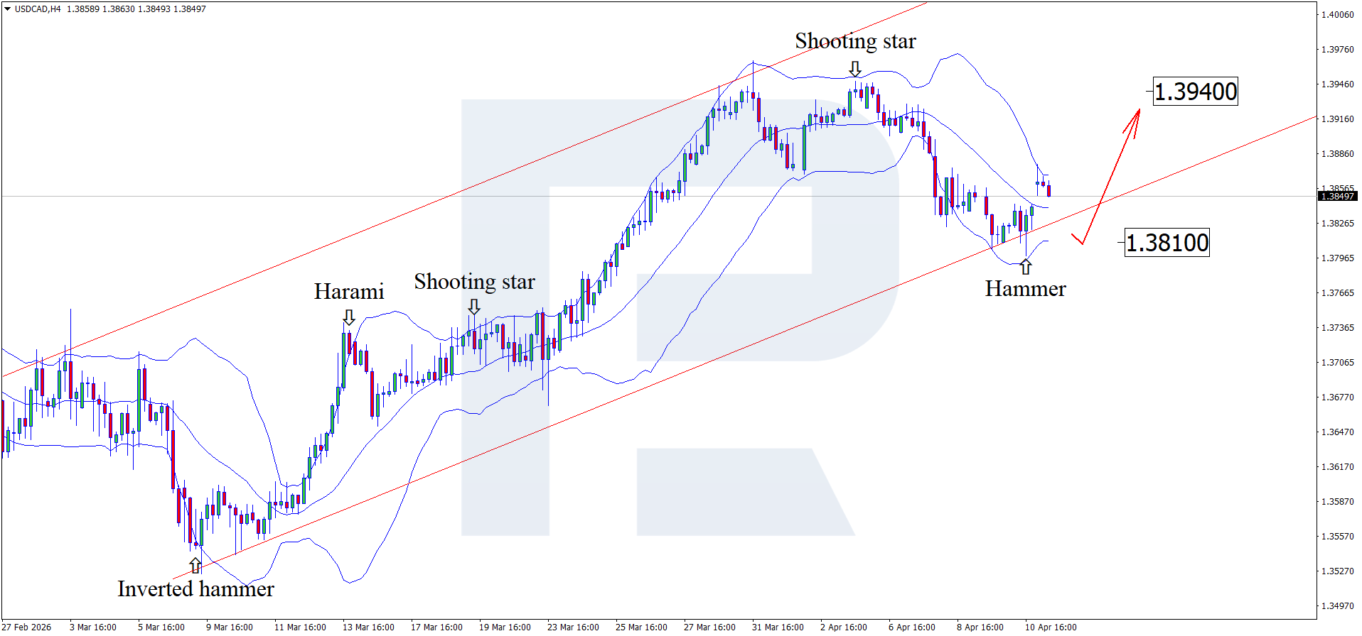 USDCAD is under pressure from geopolitics and oil prices, with quotes testing the 1.3850 level. Details in our analysis for 13 April 2026.