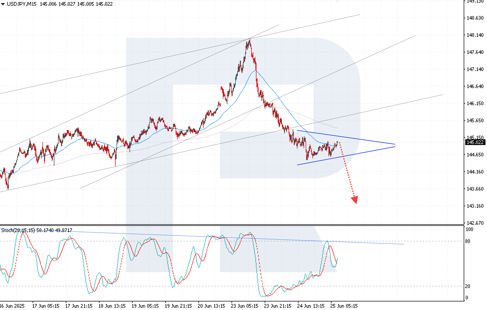 The USDJPY pair is consolidating after a decline, with pressure on the currency pair persisting. The price currently stands at 145.02. Find out more in our analysis for 25 June 2025.