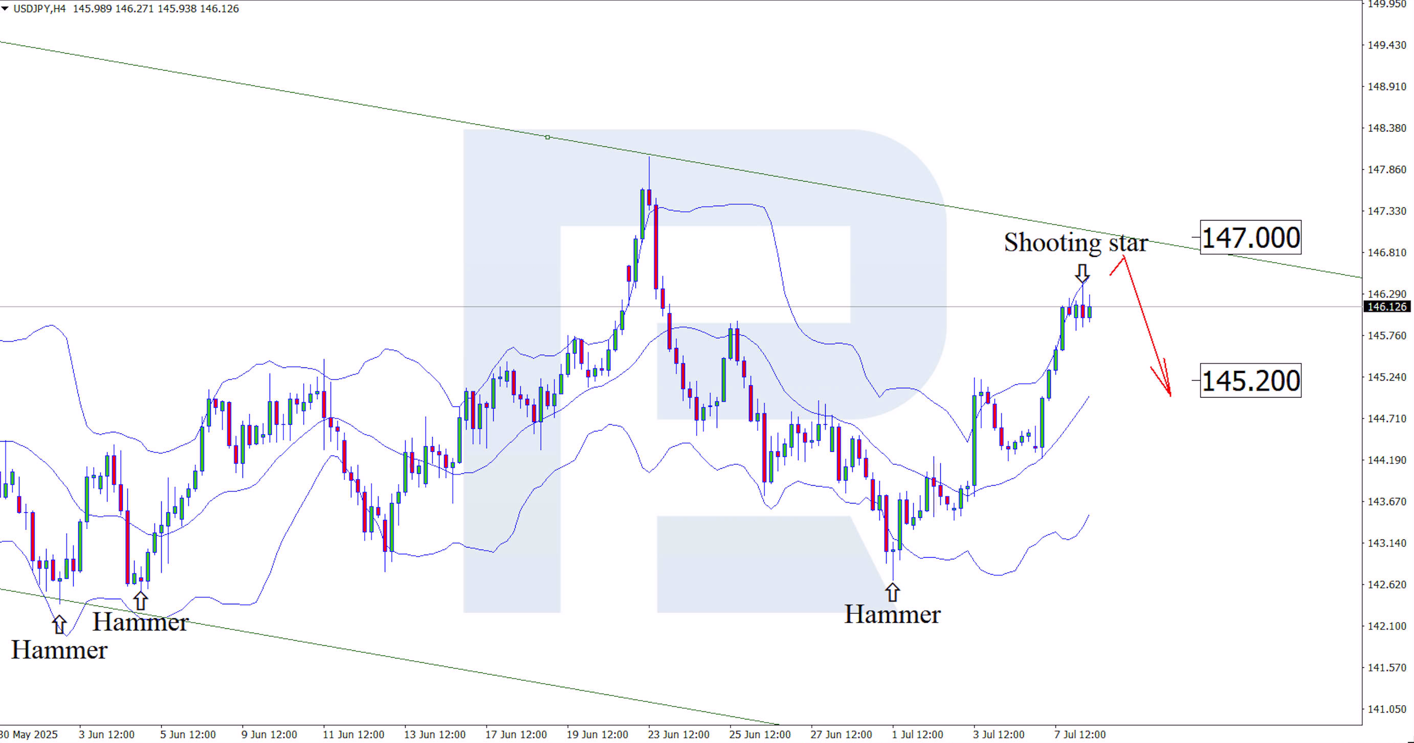 USDJPY reacts specifically to tariffs on goods from Japan; quotes may form a correction towards support around 145.20. Details – in our analysis for 8 July 2025.