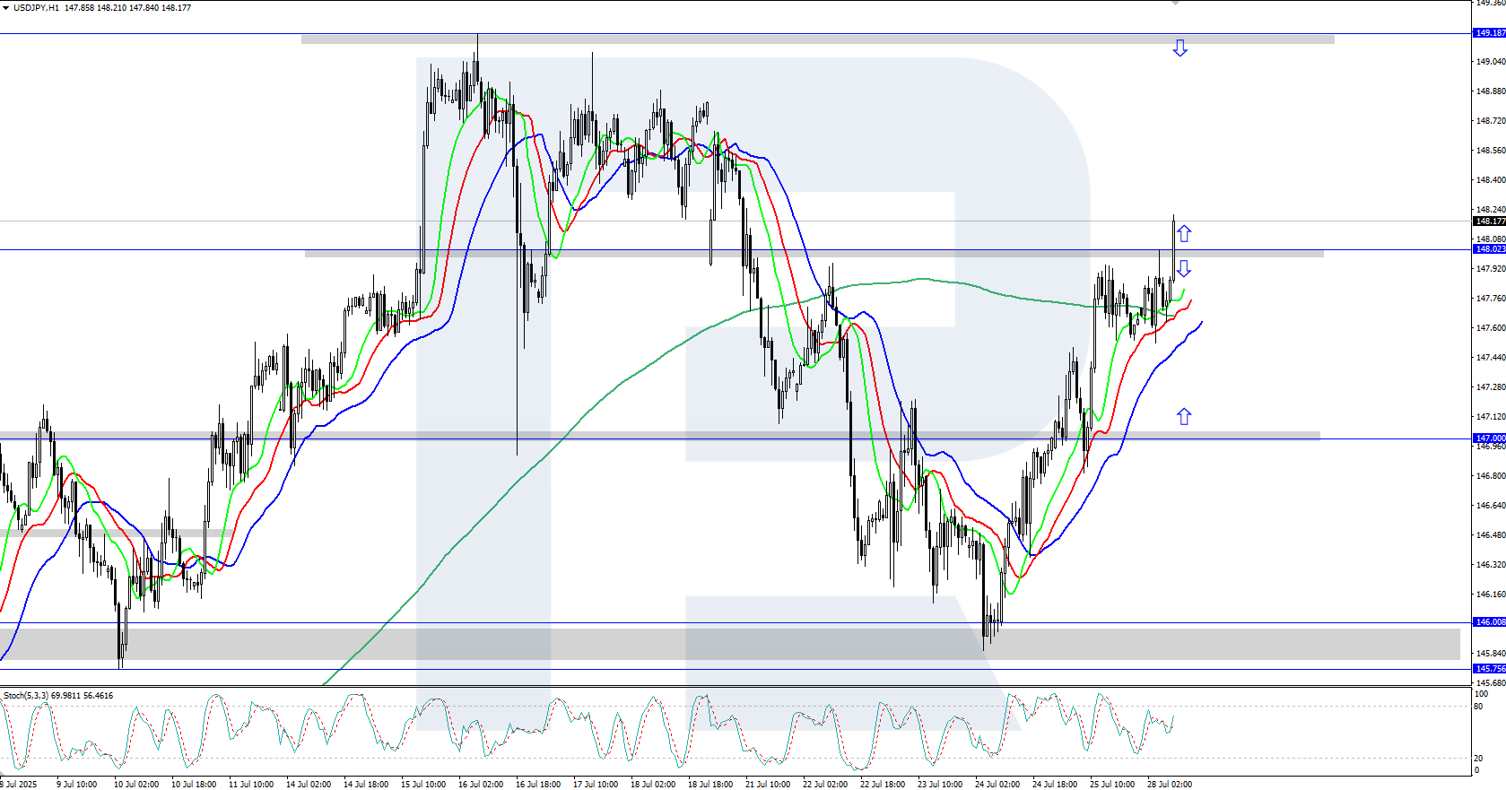 The USDJPY pair is moderately strengthening, rising above 148.00 ahead of this week’s key monetary policy decisions from the Bank of Japan and the US Federal Reserve. Find out more in our analysis for 28 July 2025.