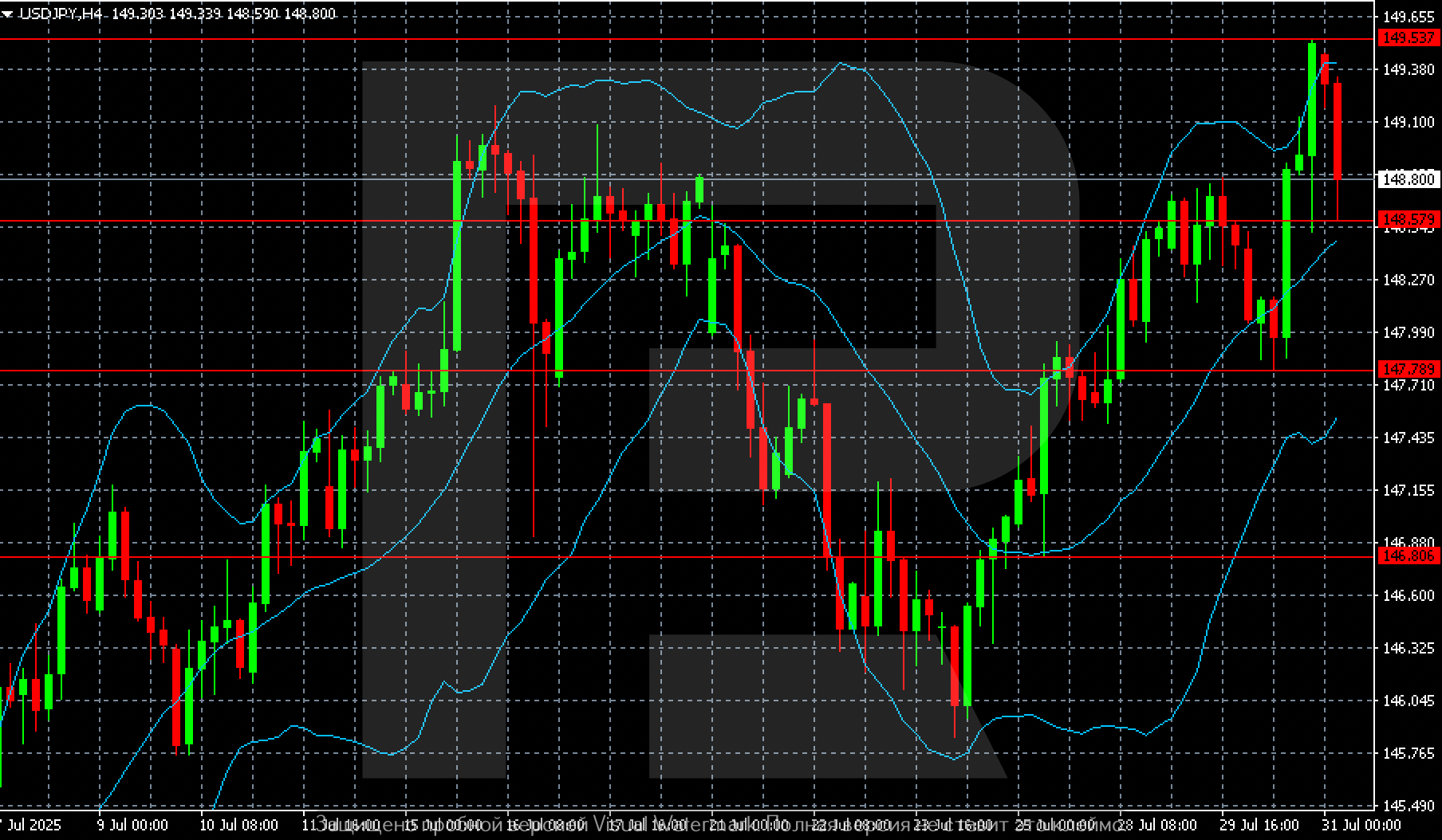 The USDJPY pair is undergoing a local correction, but the overall sentiment remains positive. The USDJPY forecast for today, 31 July 2025, suggests a deeper correction towards 148.58, from where a move towards 147.80 may unfold.