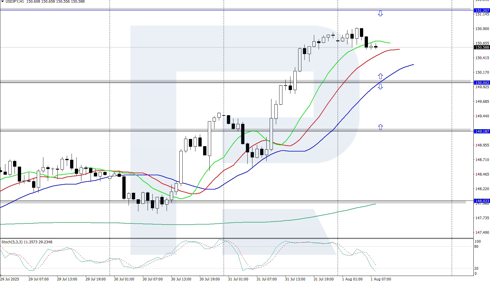 The USDJPY pair is soaring, having broken above 150.00 amid strong demand for the dollar and an unchanged Bank of Japan interest rate. Today, the US labour market data is in focus. Find out more in our analysis for 1 August 2025.