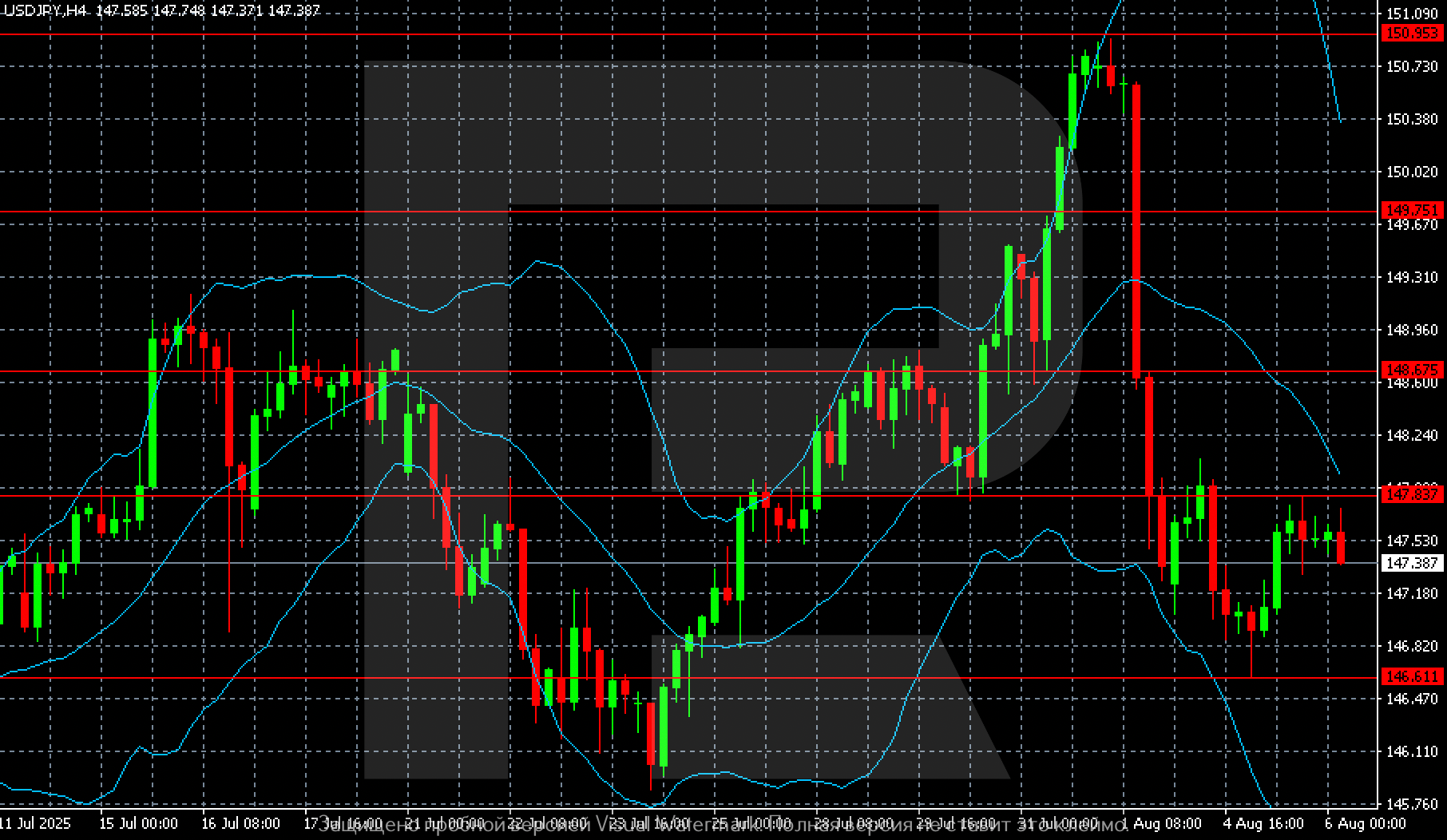 Despite the yen's fundamental challenges, the USDJPY pair may come under pressure. The USDJPY forecast for today, 6 August 2025, does not rule out a move down to 146.61.