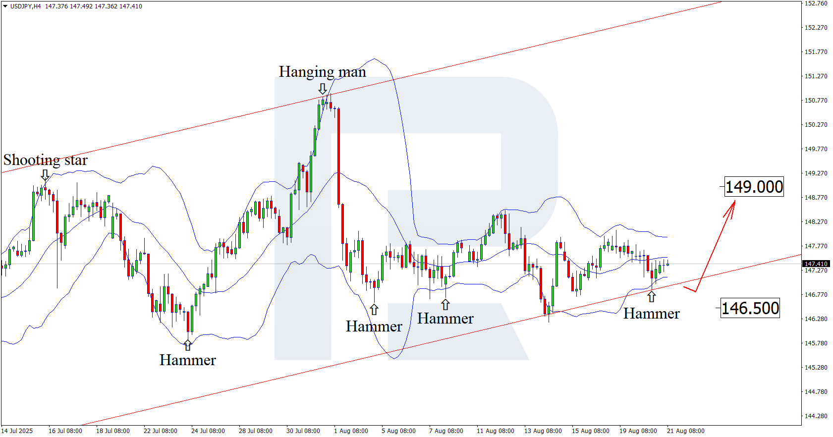 Having tested the lower Bollinger Band, the USDJPY pair formed a Hammer reversal pattern near 147.40 on the H4 chart. At this stage, the pair may continue its upward trajectory in line with the pattern’s signal. The USDJPY rate remains within an ascending channel, which supports the case for growth towards resistance near 149.00.