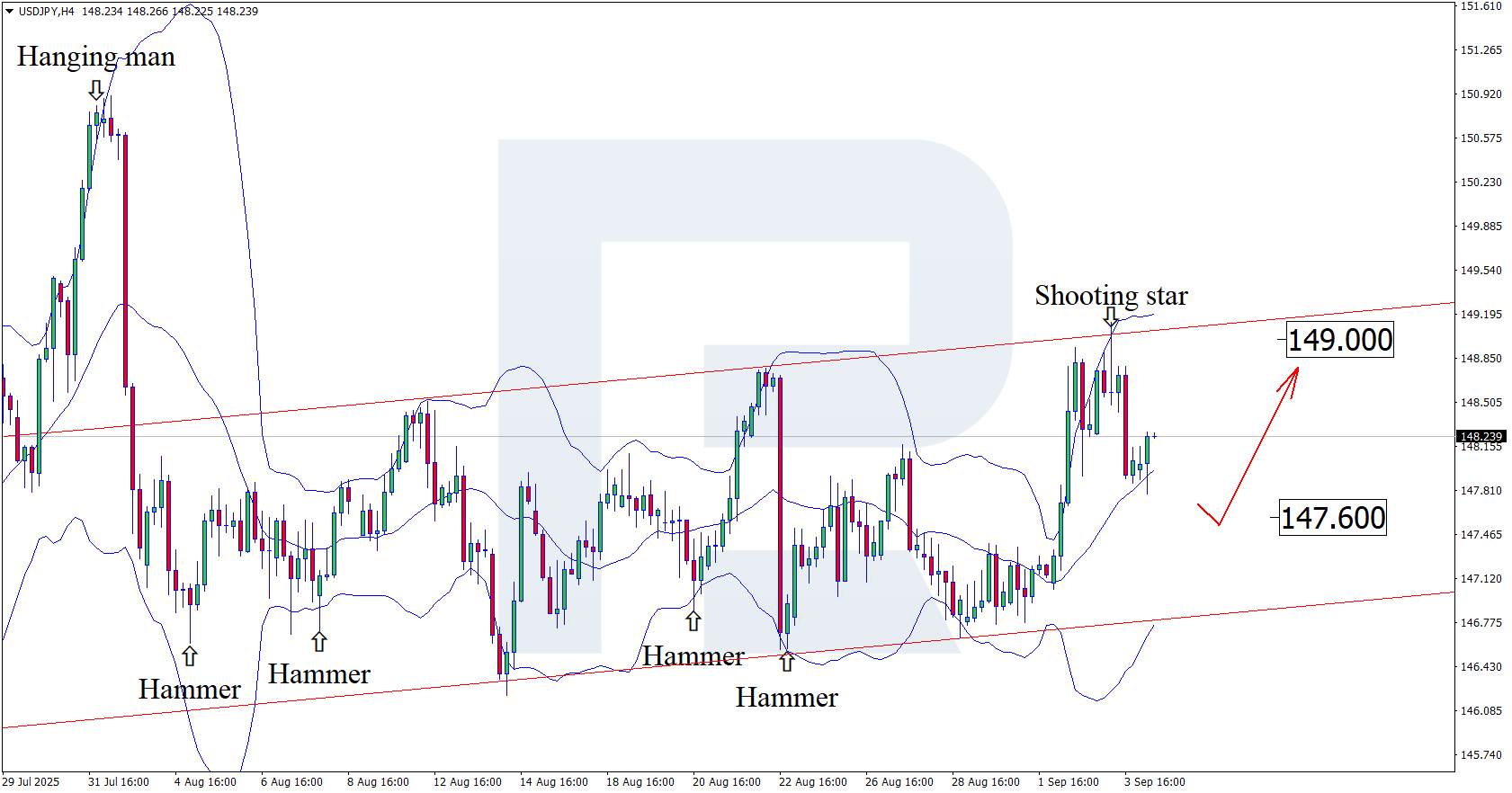 The fundamental outlook for 4 September 2025 shows that the USDJPY pair continues its correction, trading around 148.20.