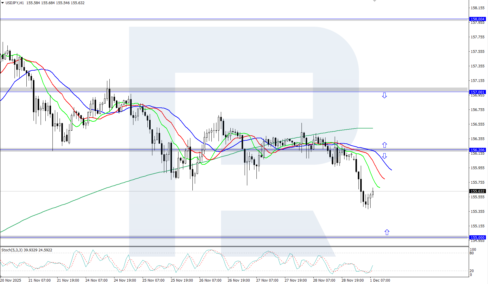 The USDJPY exchange rate is moderately declining, falling below 156.00 amid expectations of a possible rate hike by the Bank of Japan at its December meeting. Find out more in our analysis for 1 December 2025.