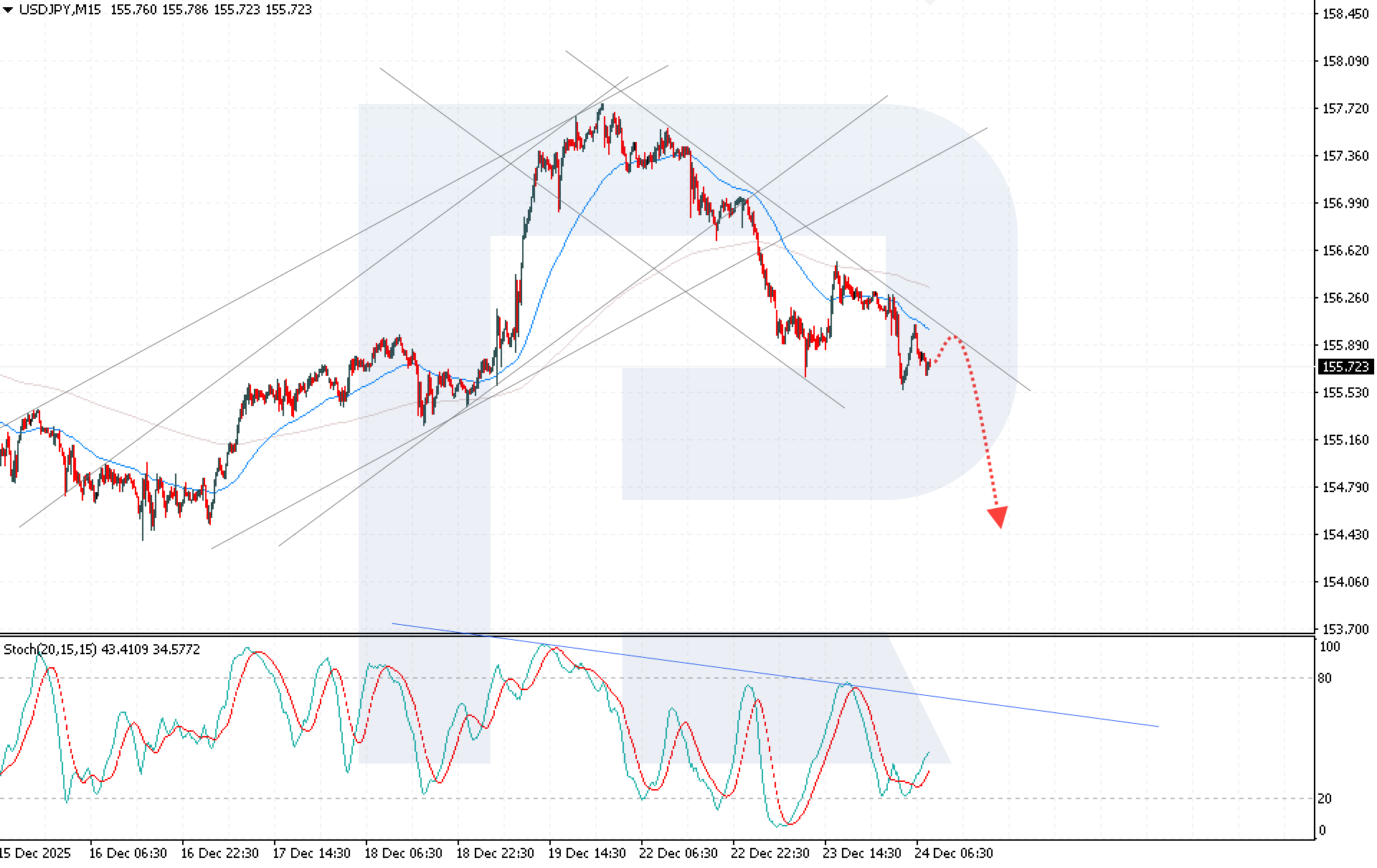 USDJPY continues to decline as the Japanese yen strengthens amid signals from the Bank of Japan pointing to a potential tightening of monetary policy. The current price is 155.72. Details — in our analysis for 24 December 2025.