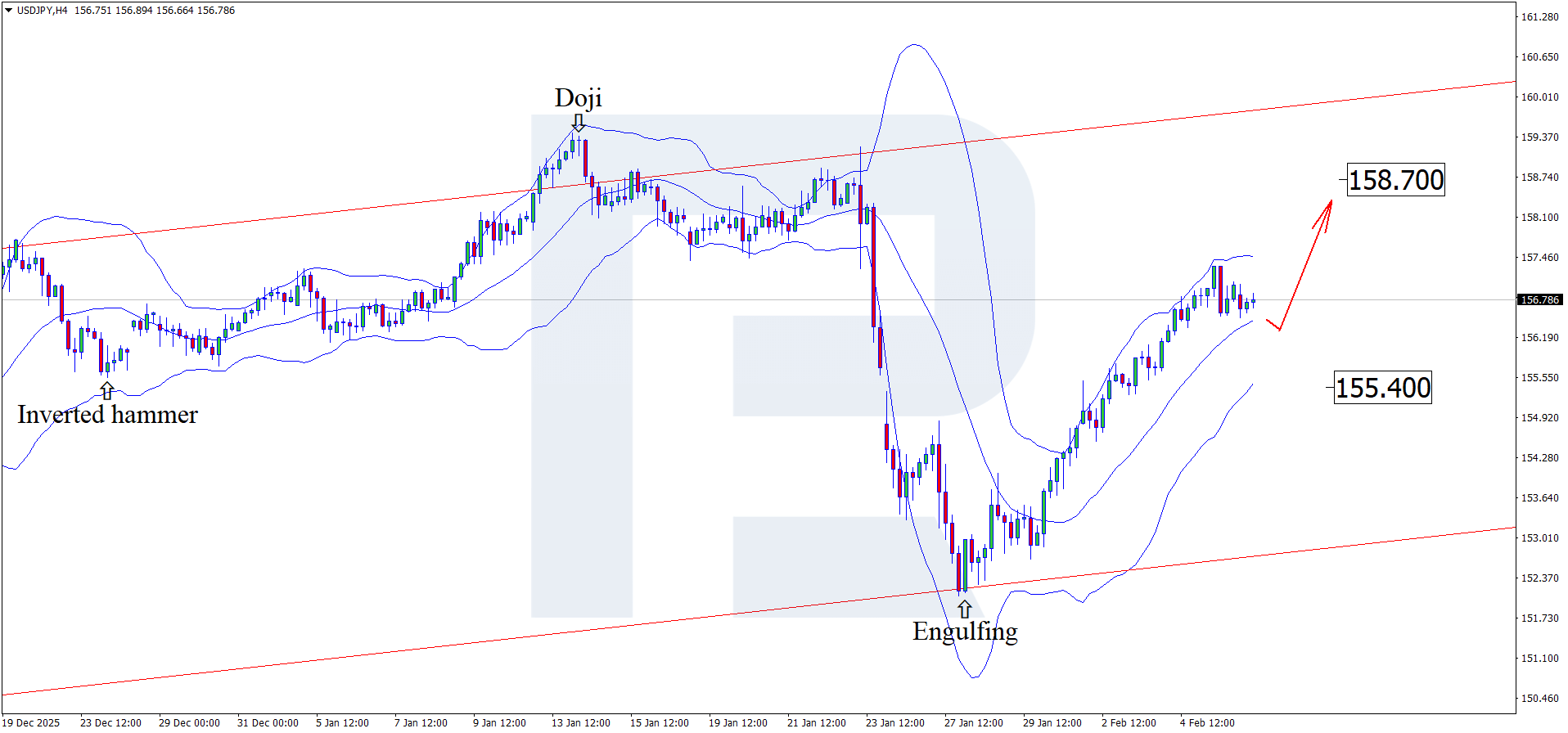 The outlook for 6 February 2026 appears favourable for the USD. The USDJPY pair is forming a corrective wave and may continue its upward trajectory, with quotes currently trading near the 156.70 level.