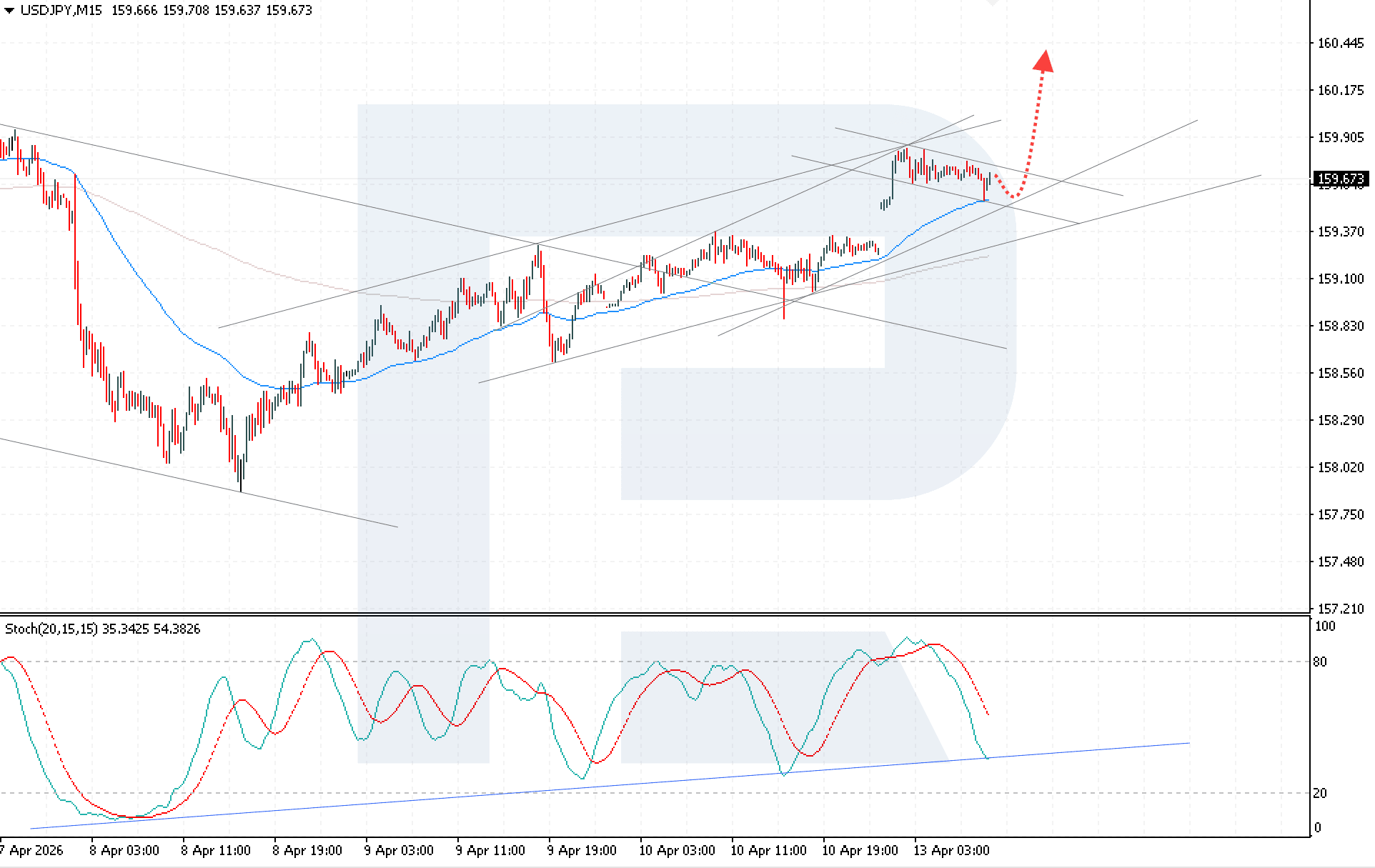Rising geopolitical tensions and a jump in oil prices are increasing pressure on the yen, pushing USDJPY toward key levels. The current quote is 159.67. Details in our analysis for 13 April 2026.