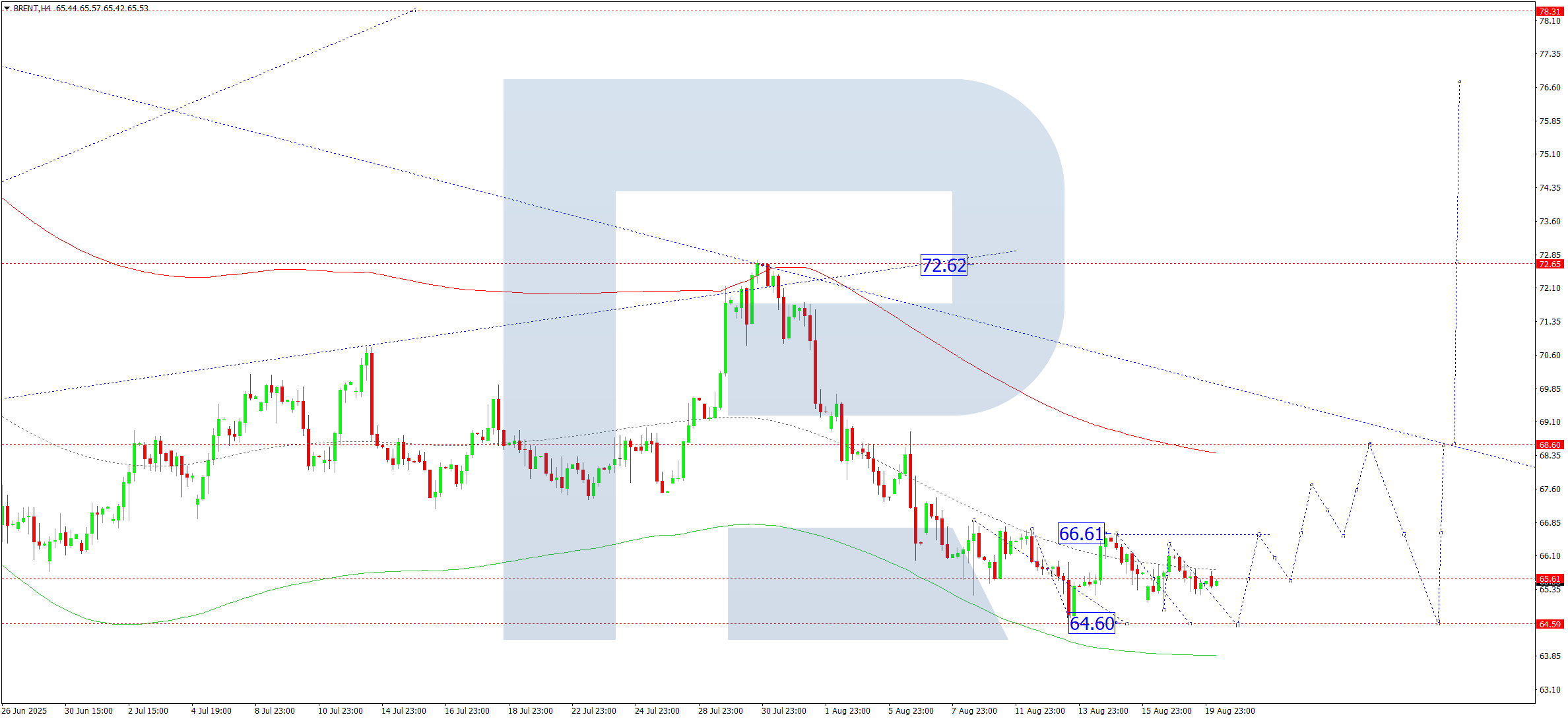 On the H4 chart of Brent, the market continues consolidating around 65.60 without a clear trend. Today, 20 August 2025, the range may extend downwards to 64.60, followed by a rise to 66.60. A breakout above this level may extend the upward wave to 68.60 with the prospect of continuing the trend to 72.60.