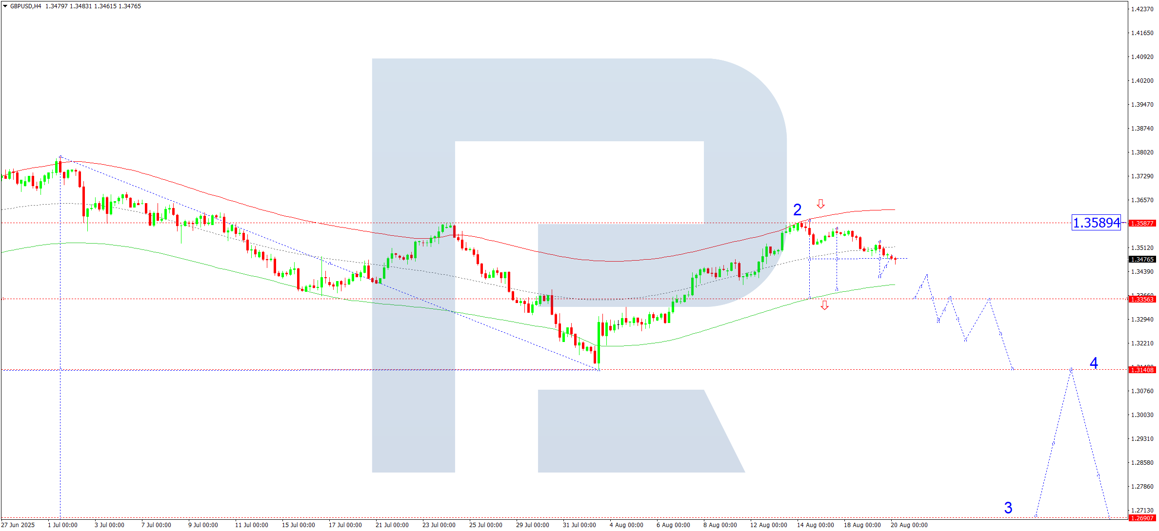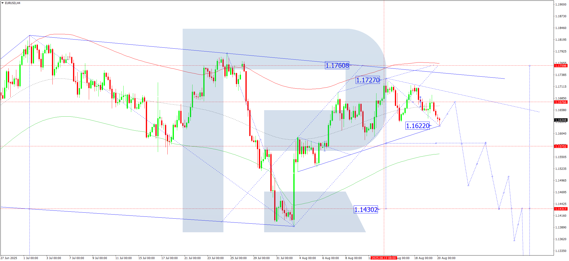 On the H4 chart of EURUSD, the market completed a downward wave to 1.1622. Today, 20 August 2025, the pair may see a corrective movement towards 1.1676 (testing from below). The main scenario suggests a decline to 1.1577, followed by growth to 1.1620. If the 1.1577 level breaks downwards, the wave may extend to 1.1485, with the prospect of continuing the trend to 1.1430 as a local target.