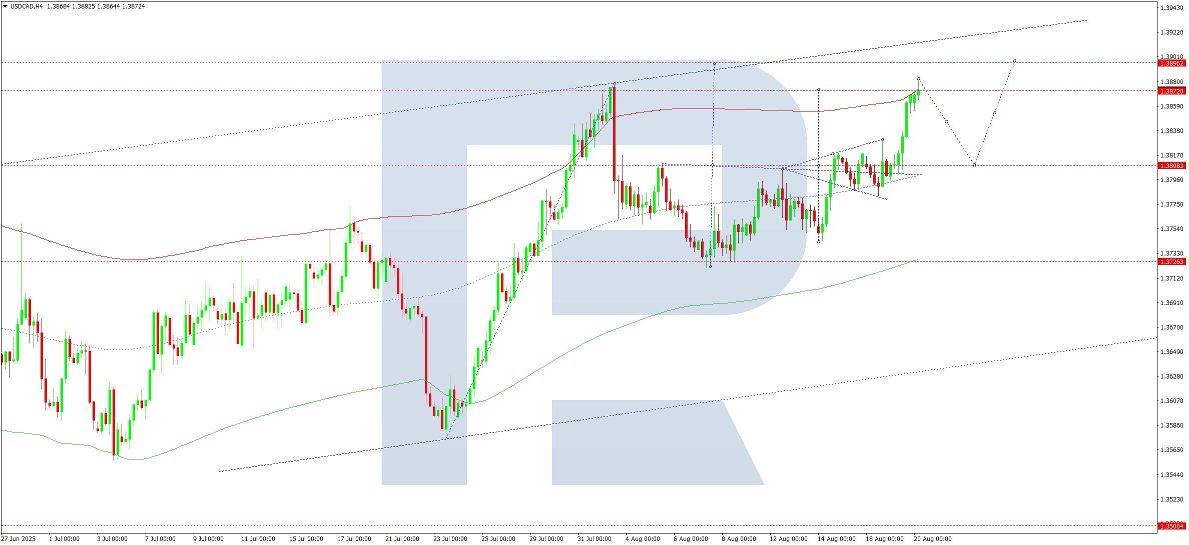 On the H4 chart of USDCAD, the market completed a growth wave to 1.3880, reaching a local target. Today, 20 August 2025, a correction to 1.3800 (testing from above) is possible, followed by another upward wave to 1.3895.
