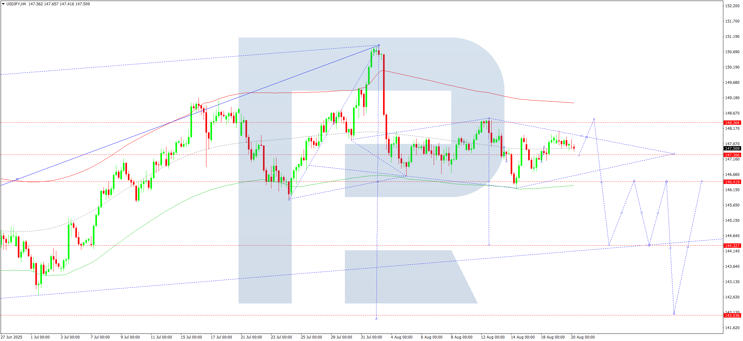 On the H4 chart of USDJPY, the market continues consolidating around 147.30. Today, 20 August 2025, a movement towards the upper boundary of the range at 148.30 is possible. A breakout above will open potential for a rise to 149.11. A downward breakout may lead to a move towards 144.33, a local target.