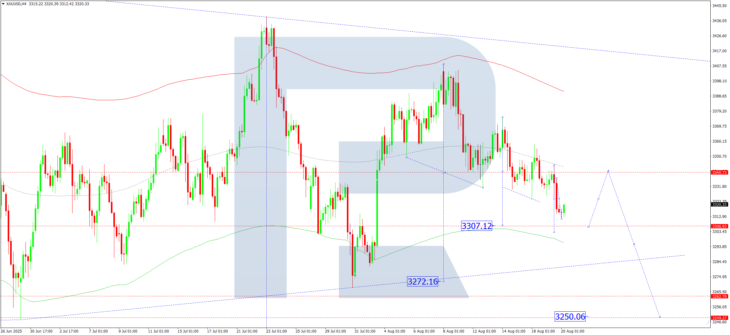 On the H4 chart of XAUUSD, the market broke the lower boundary of the consolidation range, opening potential for a decline to 3,307 as a local target. Today, 20 August 2025, prices could reach this target before undergoing a correction towards 3,340 (testing from below).