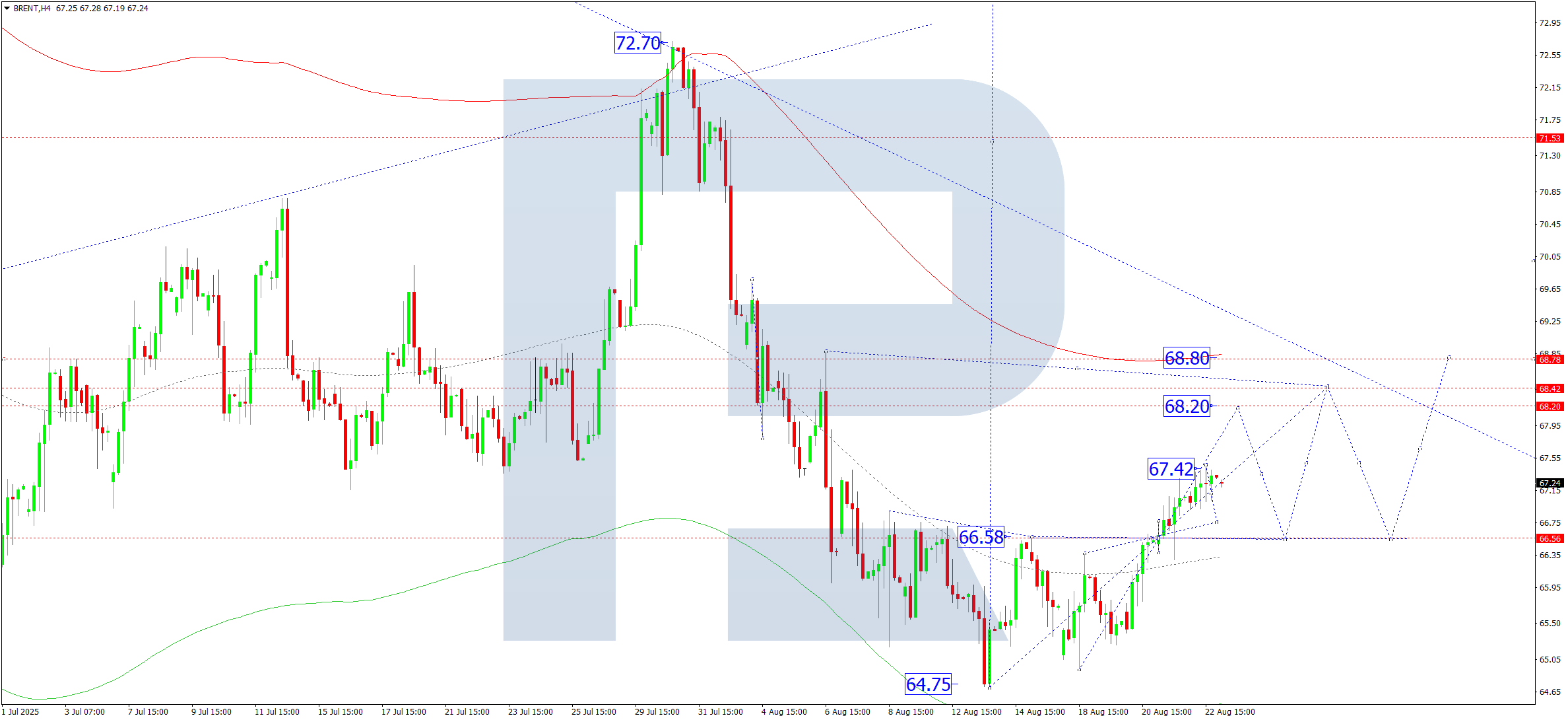 On the H4 chart of Brent, the market completed a growth wave to 67.42. Today, 25 August 2025, a correction to 66.60 is possible. Afterwards, the market may grow to 68.20, with the prospect of continuing the trend to 68.40 as the first target.