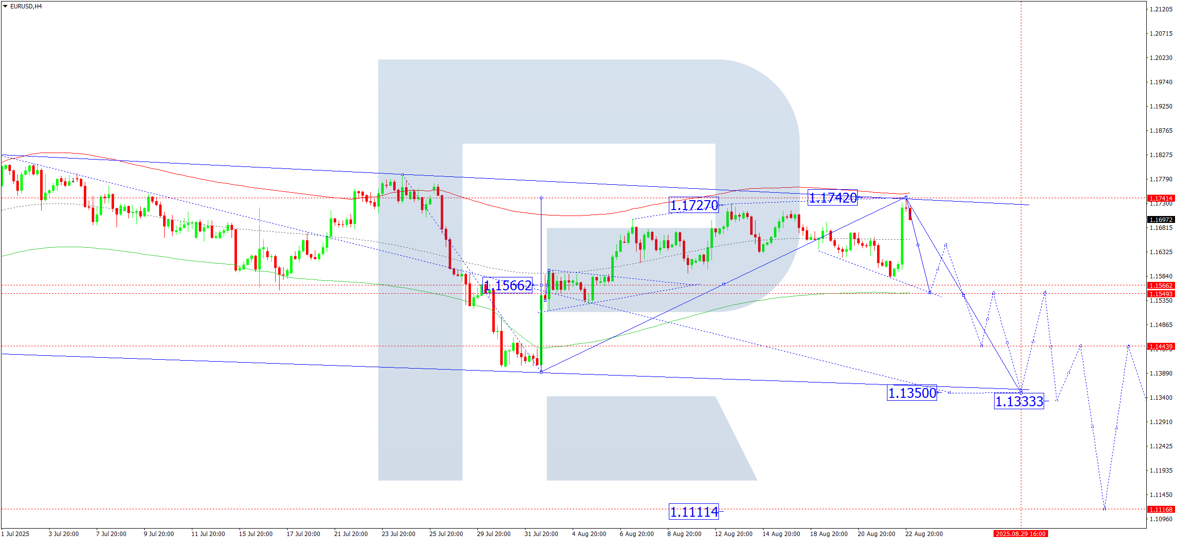 On the H4 chart of EURUSD, the market received support at 1.1583 and completed another corrective growth structure to 1.1742. Today, 25 August 2025, a downward wave is expected to start, aiming for 1.1550. After reaching this level, a rise to 1.1646 is possible. Practically, the market continues to form a wide consolidation range around 1.1646.
