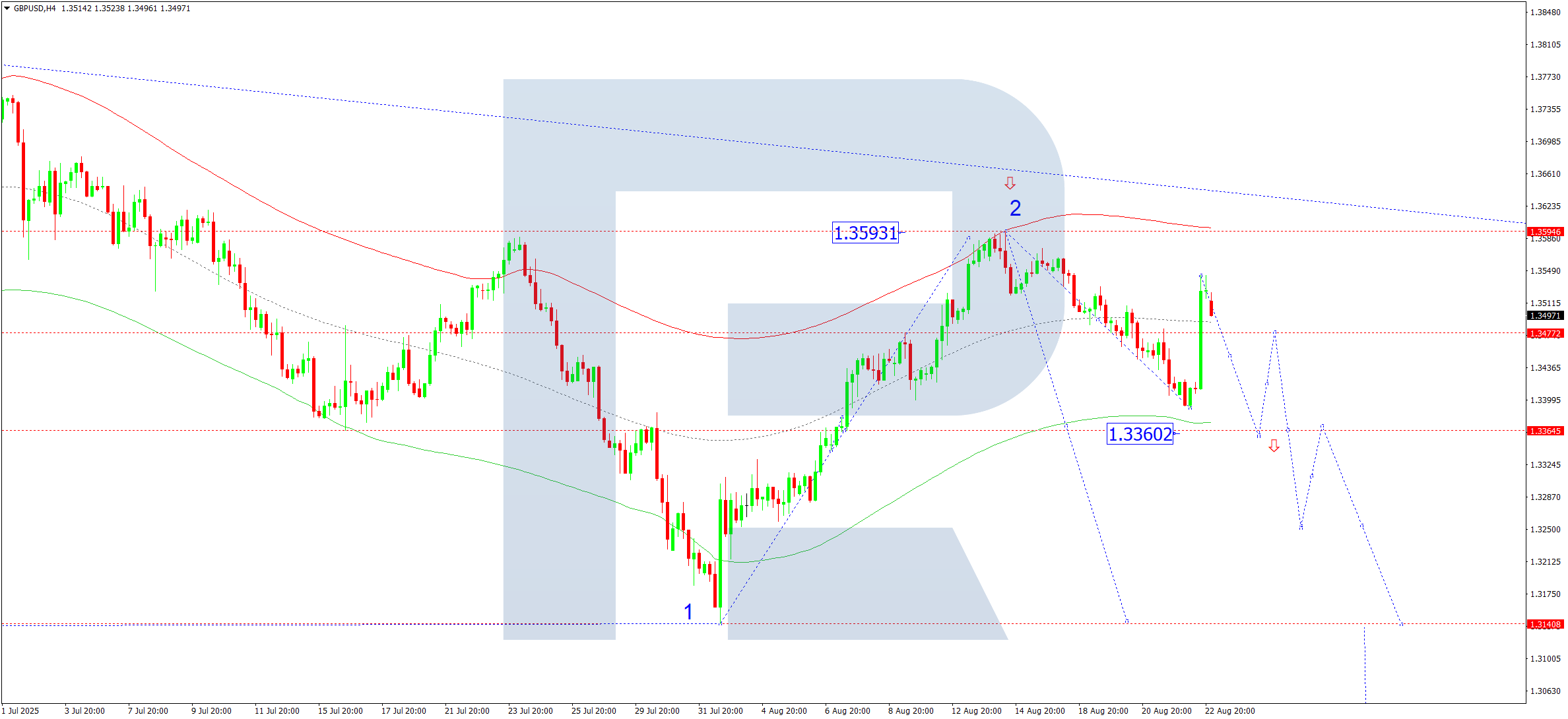 On the H4 chart of GBPUSD, the market corrected towards 1.3540. Today, 25 August 2025, a downward wave is expected to start, aiming for 1.3360. After reaching this level, a correction to 1.3500 is possible. The market is practically forming a wide consolidation range around this level. A further decline to 1.3140 remains relevant as the first target in the next wave.