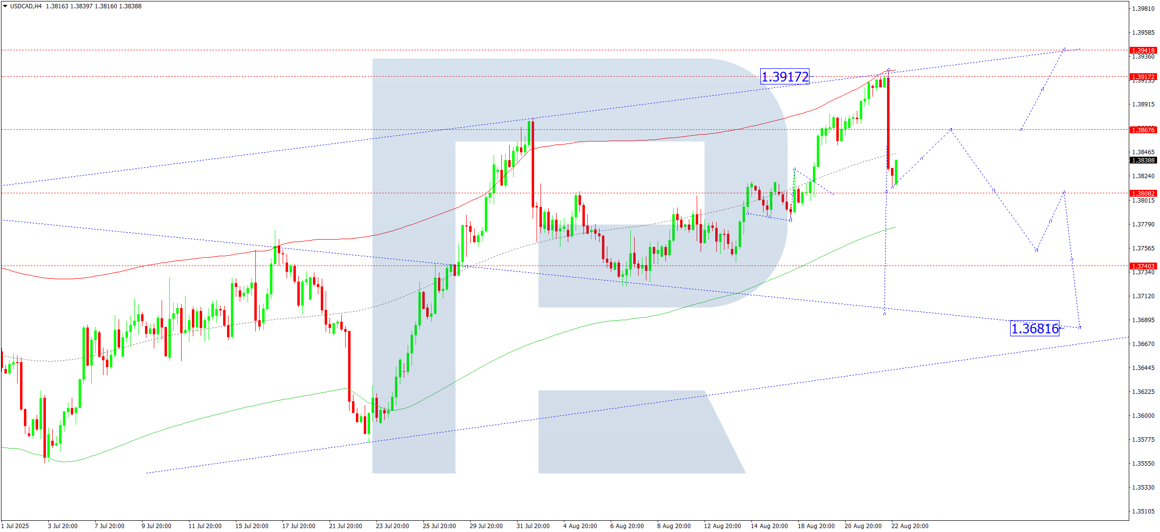 On the H4 chart of USDCAD, the market corrected to 1.3814. Today, 25 August 2025, growth to 1.3868 is possible, setting the consolidation range boundaries around this level. If it breaks upwards, growth to 1.3942 may follow. If it breaks downwards, a continuation of the correction to 1.3777 is possible.