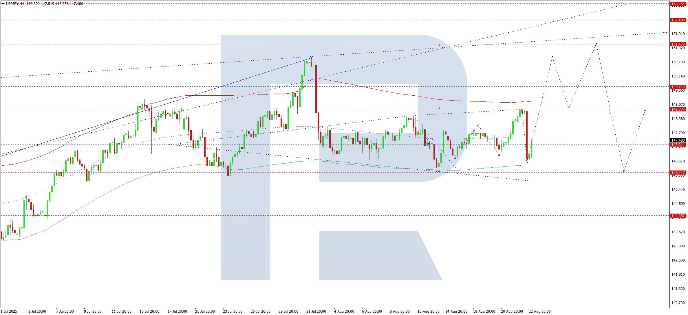 On the H4 chart of USDJPY, the market continues developing a consolidation range around 147.32. The range has been extended upwards to 148.77 and down to 146.55. A decline to 146.15 is possible. Today, 25 August 2025, if the market breaks out upwards, growth to 150.75 may follow. If it breaks downwards, a decline to 144.44 is possible.