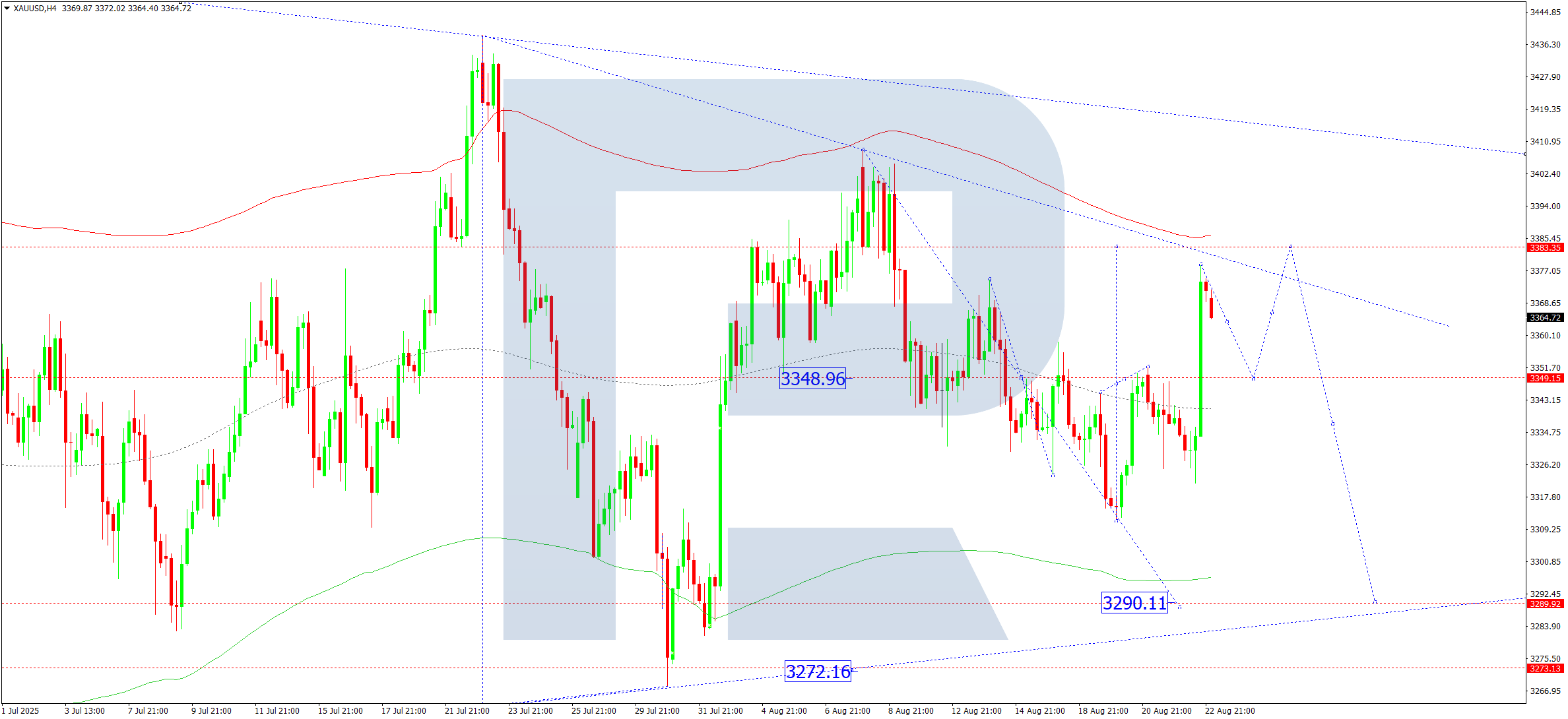 On the H4 chart of XAUUSD, the market continues to consolidate around 3,349. Recently, a growth move to 3,377 was completed. Today, 25 August 2025, prices are expected to decline to 3,349. Later, the range may expand upwards to 3,388. This growth is viewed as a correction to the previous downward wave. After that, a new downward wave to 3,290 may start.