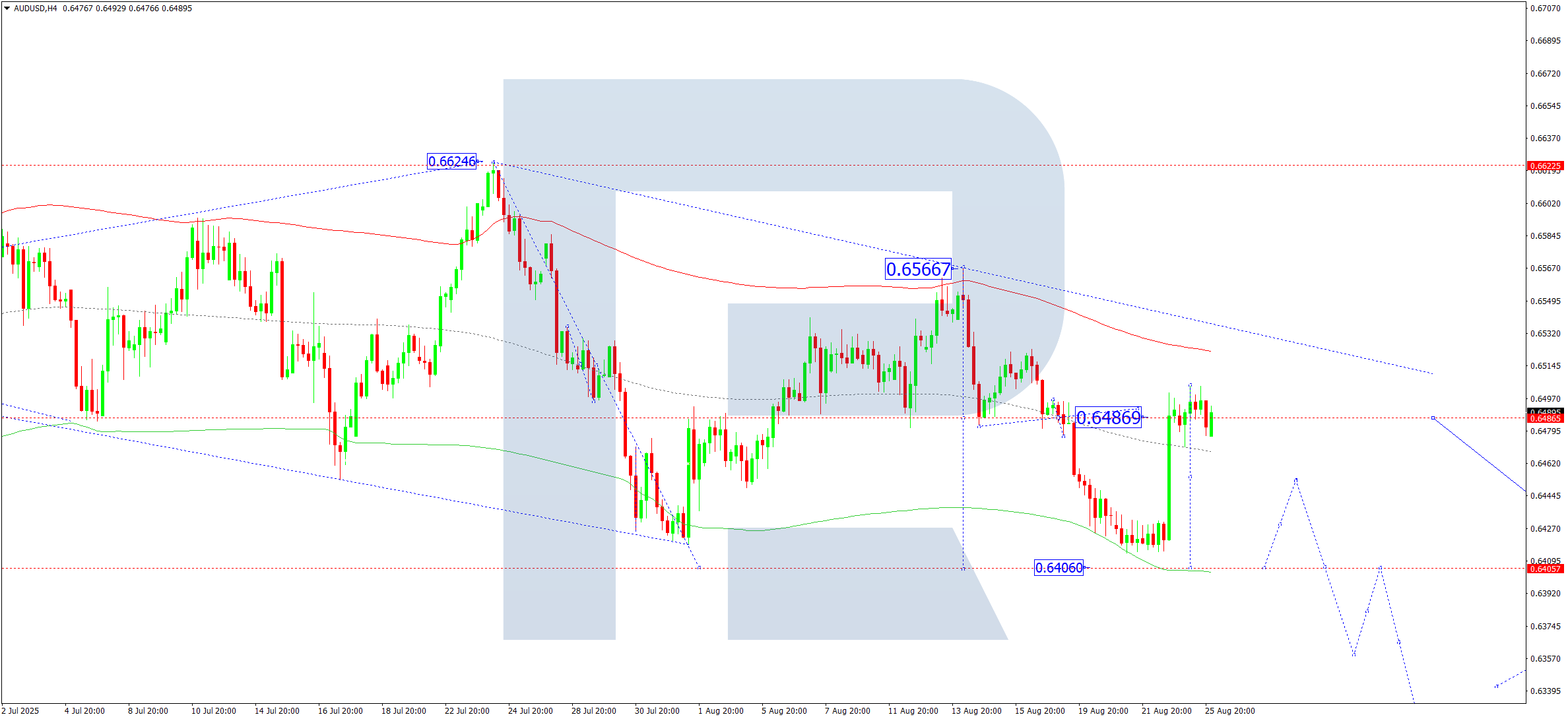 On the H4 chart of AUDUSD, the market is consolidating around 0.6486. Today, 26 August 2025, a downward breakout is expected with the downward wave continuing towards 0.6400. After reaching this level, a correction towards 0.6480 is possible.