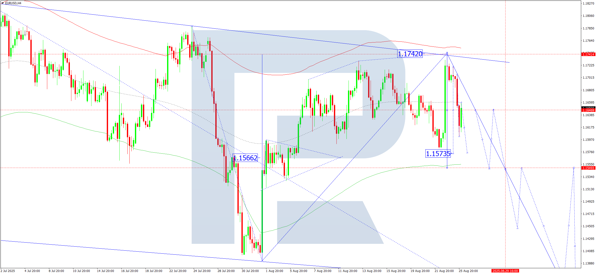 On the H4 chart of EURUSD, the market broke through 1.1650 and continues developing a downward wave to 1.1590. Today, 26 August 2025, we expect this target to be reached. Later, a correction to 1.1620 is possible, followed by another decline to 1.1550 as the first target. Practically, the market continues to develop a wide consolidation range around 1.1650.