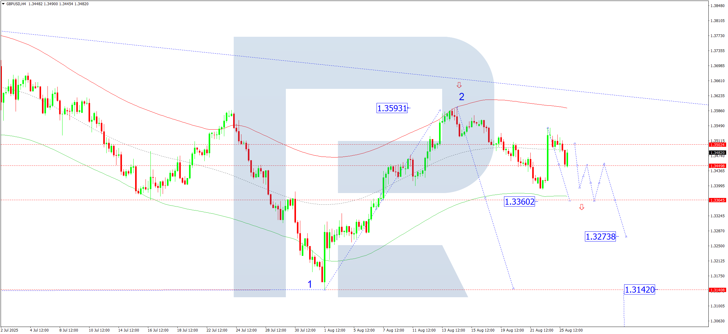 On the H4 chart of GBPUSD, the market continues to develop a downward wave to 1.3360. Today, 26 August 2025, this target may be reached. After that, a correction towards 1.3500 is possible. A wide consolidation range continues to form around this level. A further decline to 1.3140 remains relevant as the first target in the next wave.