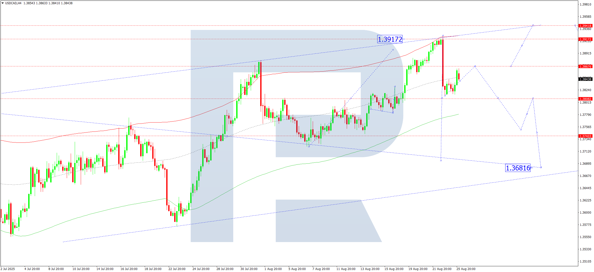 On the H4 chart of USDCAD, the market corrected to 1.3814. Today, 26 August 2025, growth to 1.3868 is possible. This will mark the consolidation range boundaries around this level. If it breaks upwards, growth to 1.3942 may follow. If it breaks downwards, the correction could continue towards 1.3777.