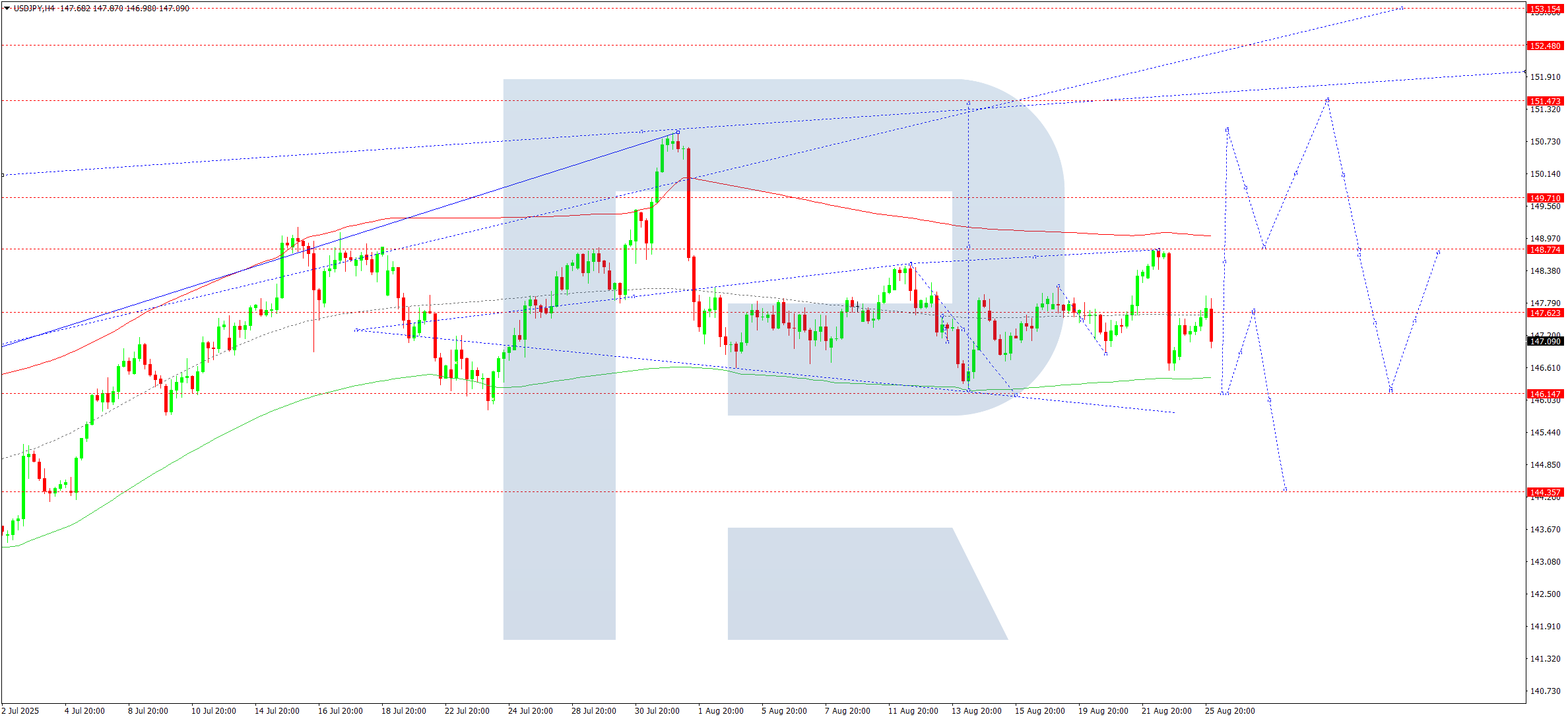 On the H4 chart of USDJPY, the market continues to consolidate around 147.32, with the range extending up to 148.77 and down to 146.55. Today, 26 August 2025, the market continues to develop a downward structure to 146.15. After reaching this level, a rise to 147.60 is possible.