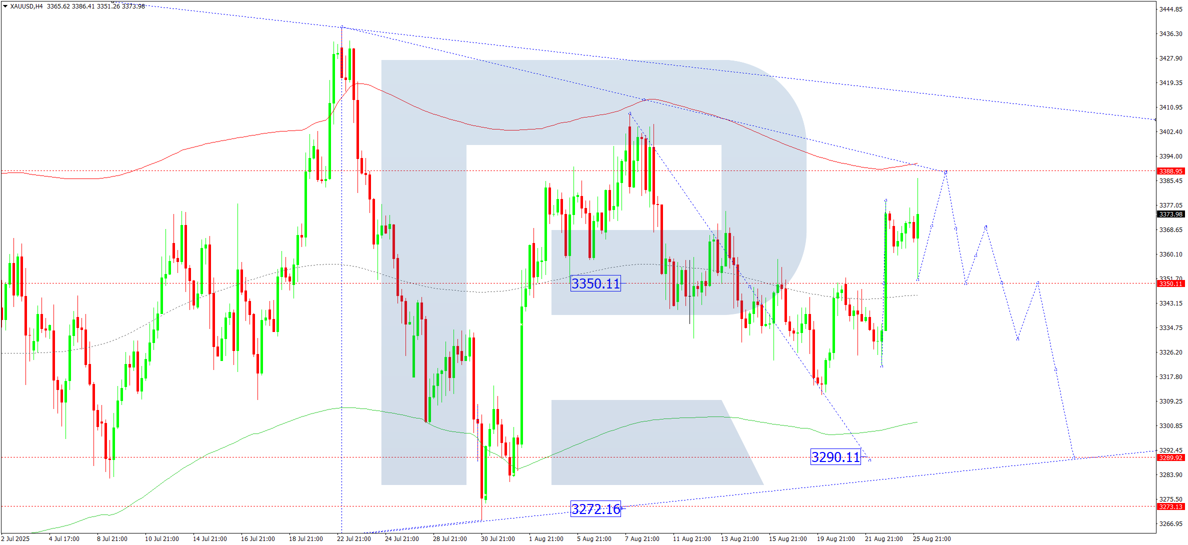 On the H4 chart of XAUUSD, the market continues to consolidate around 3,350. Recently, a rise to 3,386 was completed. Today, 26 August 2025, further growth to 3,388 is possible. Later, a new downward wave to 3,290 may follow.