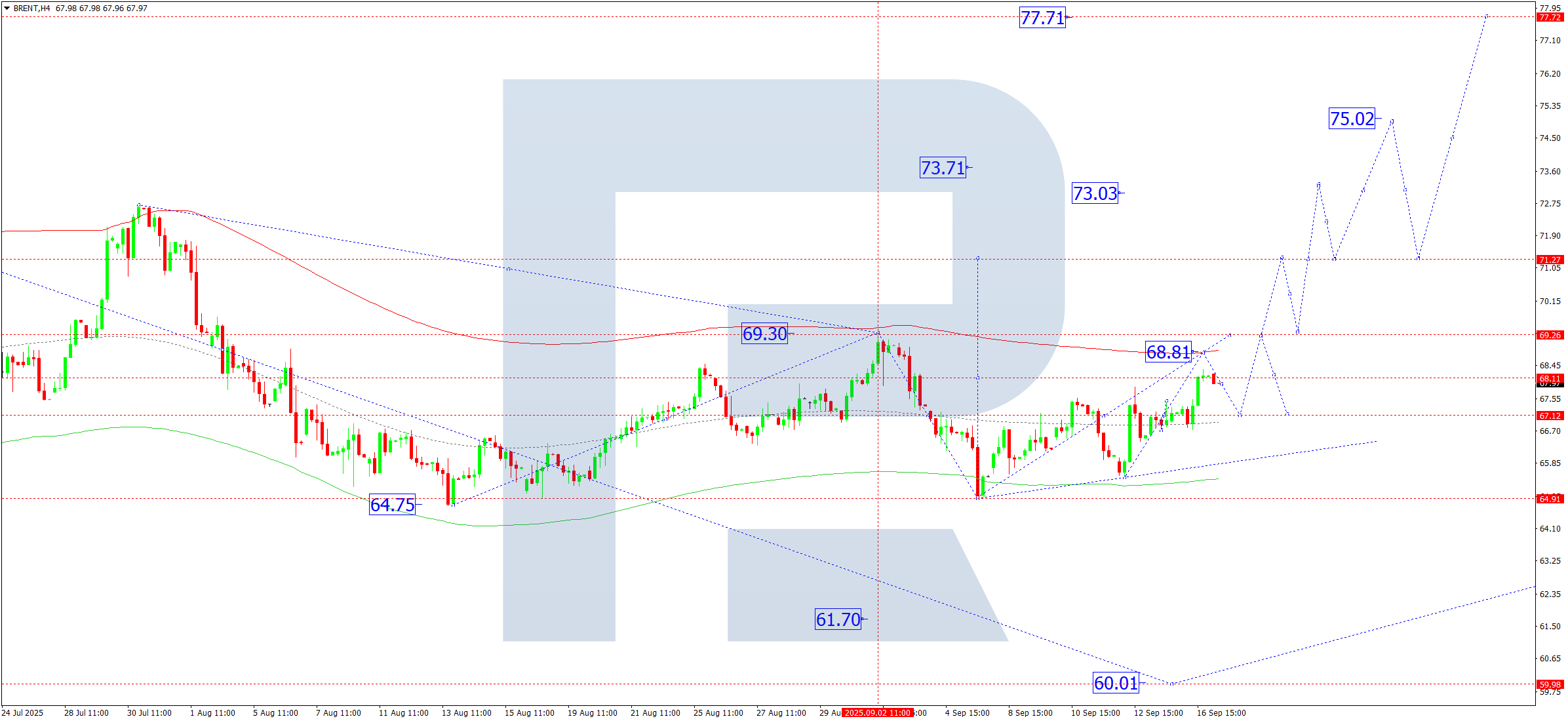 On the H4 chart of Brent, the market completed a growth wave to 68.34. Today, 17 September 2025, a continuation towards 69.30 is expected. Afterwards, a correction to 67.20 may occur, followed by growth to 71.30 with further continuation to 75.00, the local target.