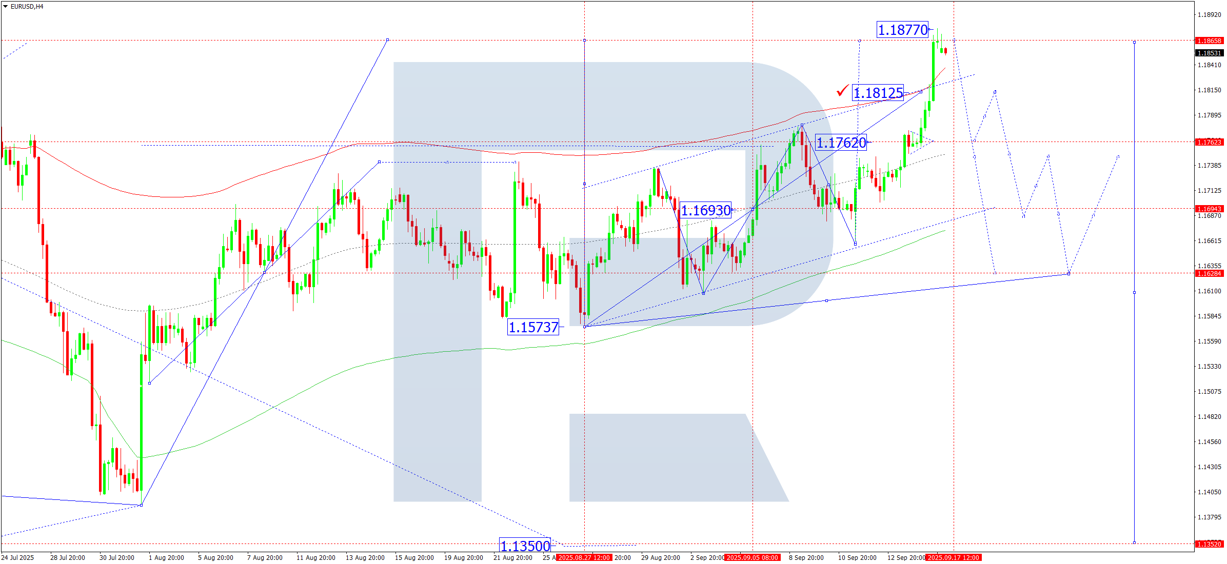 On the H4 chart of EURUSD, the market broke above 1.1766 and extended the growth wave to 1.1877. Today, 17 September 2025, a correction to 1.1766 (testing from above) is expected. Afterwards, a growth swing to 1.1812 may follow, forming a consolidation range around this level. A downward breakout would open potential for a new decline to 1.1630, the first target.