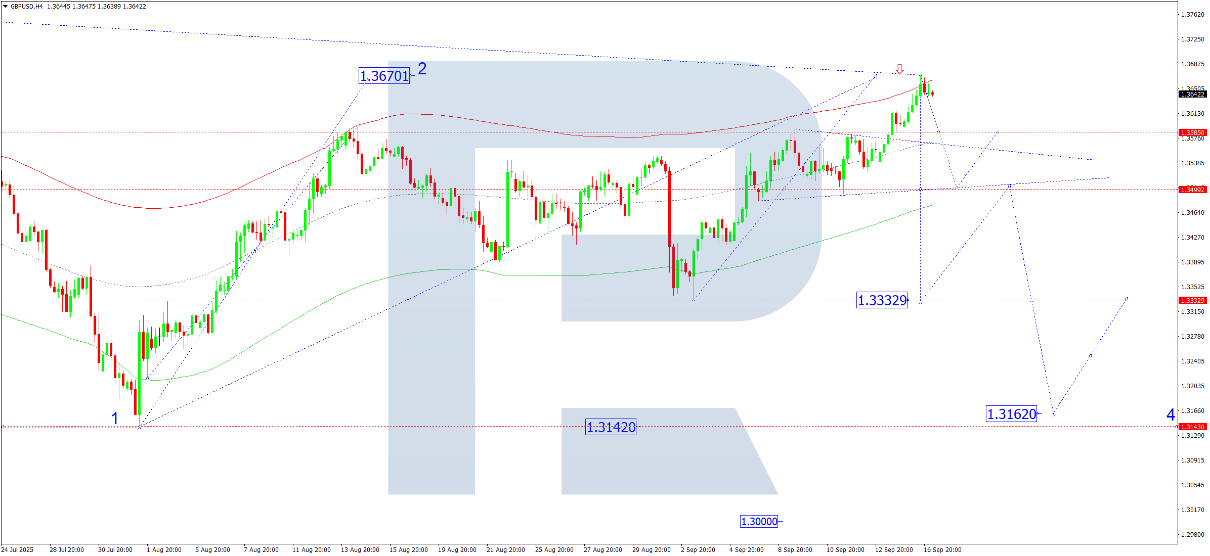 On the H4 chart of GBPUSD, the market completed a growth wave to 1.3670. Today, 17 September 2025, a new decline to 1.3500 is expected, followed by growth to 1.3580.