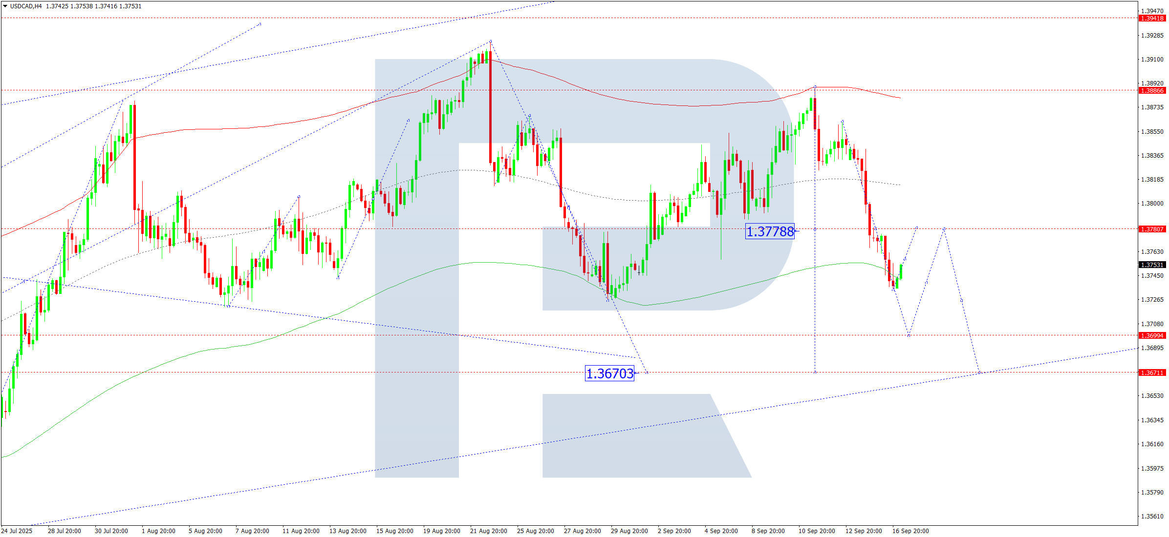 On the H4 chart of USDCAD, the market completed a decline to 1.3734. Today, 17 September 2025, a correction to 1.3778 is possible, followed by a further decline to 1.3700.