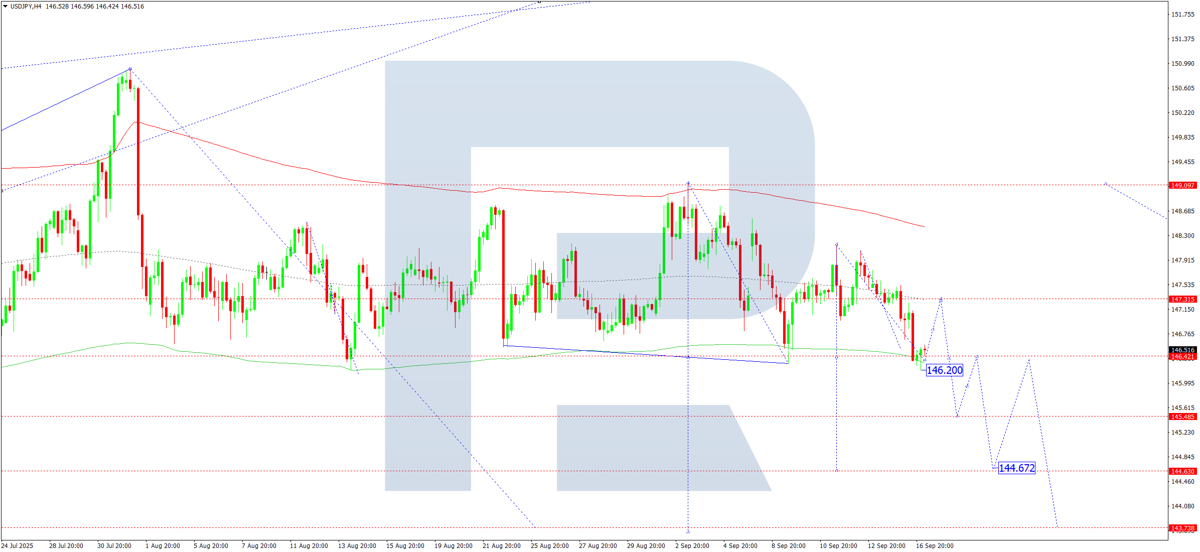 On the H4 chart of USDJPY, the market completed a decline to 146.20. Today, 17 September 2025, a correction to 147.30 is expected. The market continues to form a broad consolidation range around 147.30. A downward breakout would open potential for a further decline to 146.11 with continuation to 145.50.