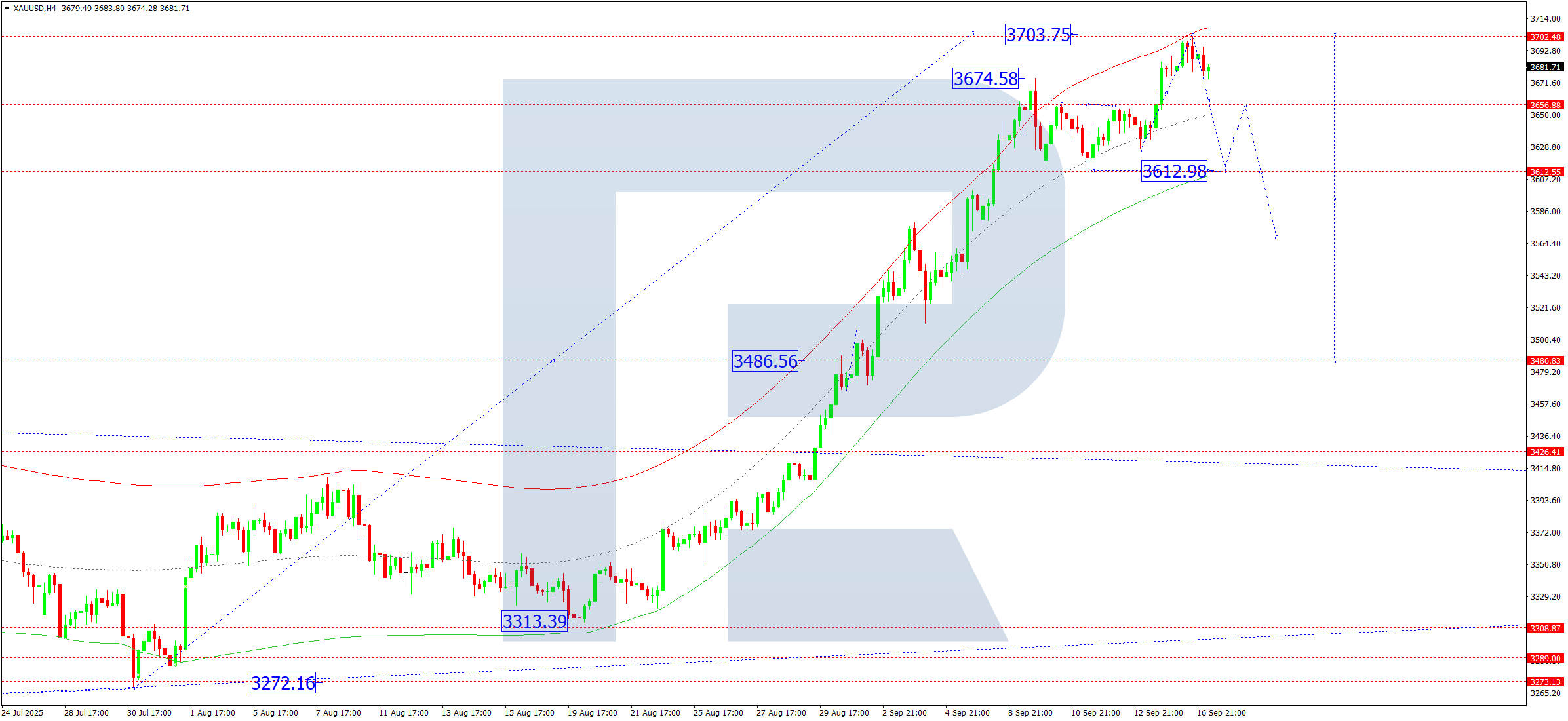 On the H4 chart of XAUUSD, the market completed a growth wave to 3,703. Today, 17 September 2025, a decline to 3,613 is expected, followed by growth to 3,656. A consolidation range may form around this level. A downward breakout would open potential for a decline to 3,486.