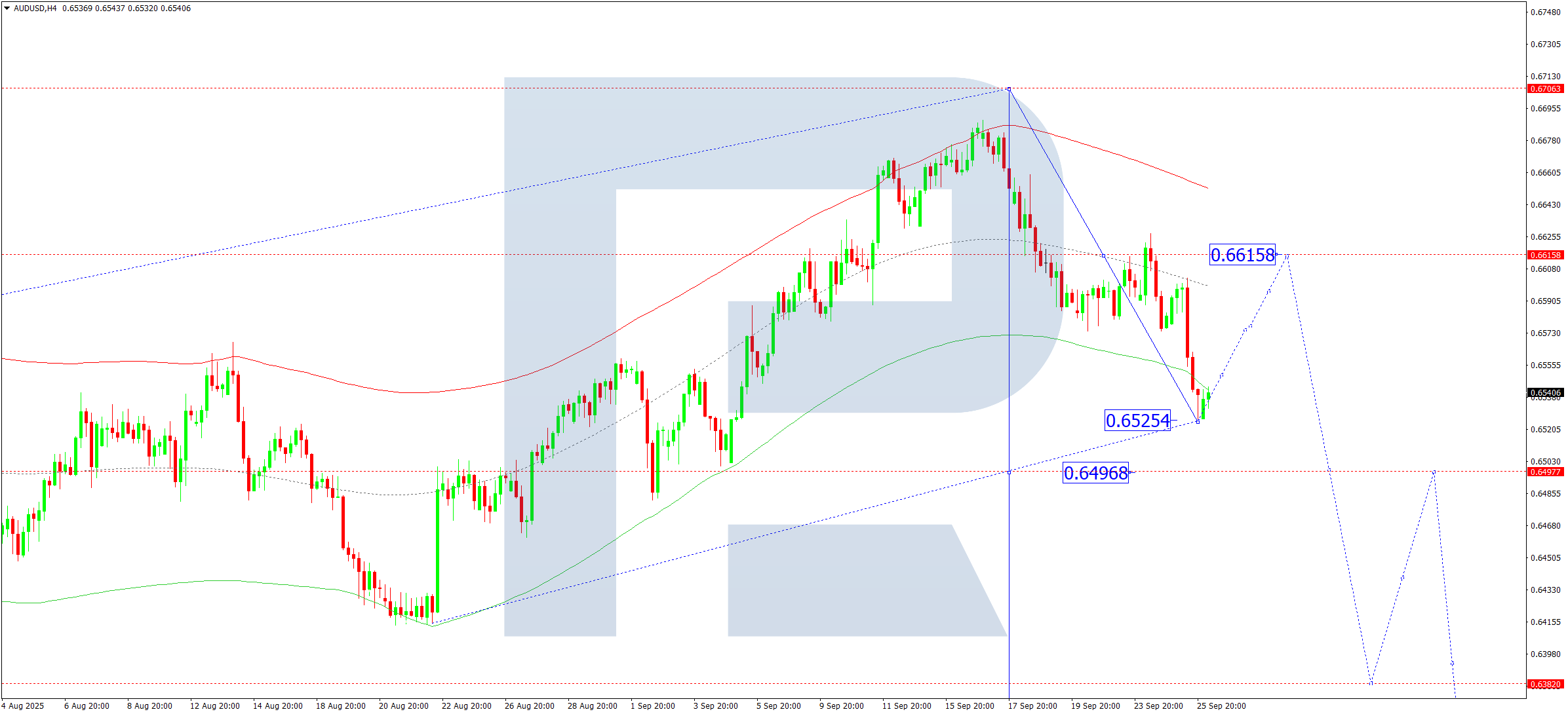On the H4 chart of AUDUSD, the market completed the first downward wave to 0.6525. Today, 26 September 2025, consolidation has formed above this level. An upward breakout may start a correction to 0.6575 at minimum, and potentially extend to 0.6616. Afterwards, another downward wave may develop towards 0.6496.