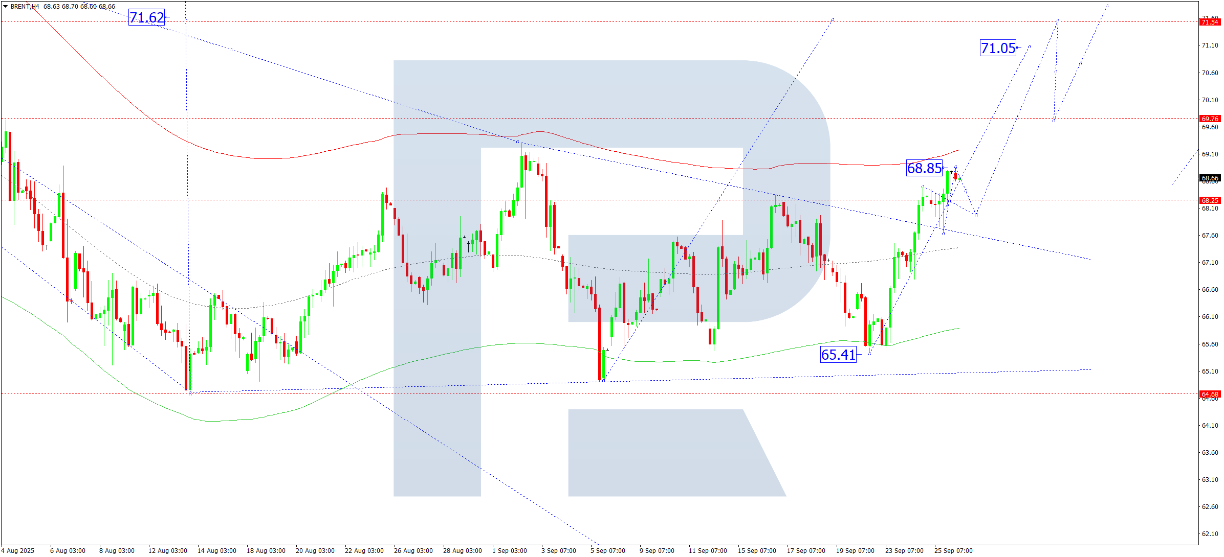 On the H4 chart of Brent, the market is consolidating around 68.25, with the range extended upwards to 68.85. Today, 26 September 2025, a move downwards to 68.00 is possible. Afterwards, an upward breakout may continue the wave towards 71.05, with prospects of extending the trend to 71.50.