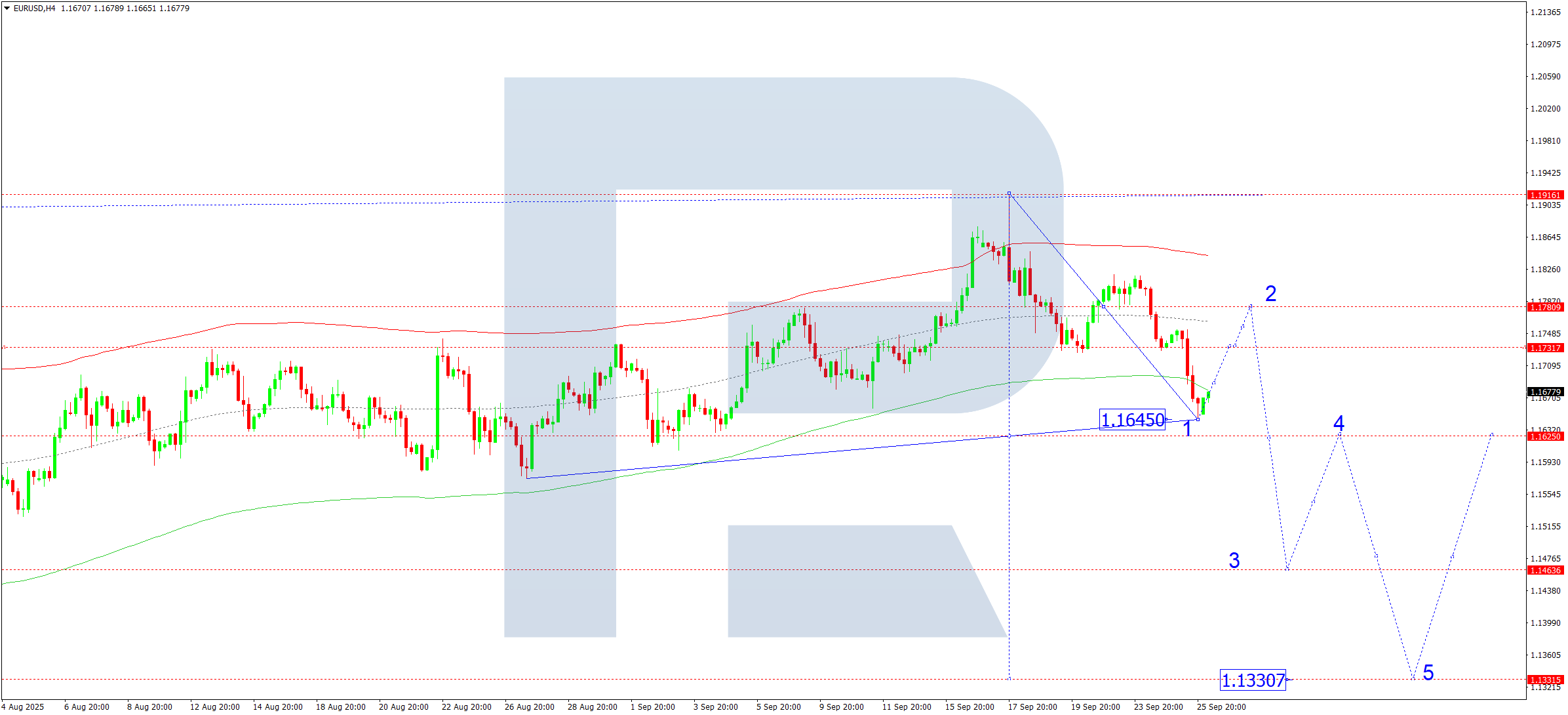 On the H4 chart of EURUSD, the market completed a downward wave to 1.1645, reaching the first target. Today, 26 September 2025, a consolidation range has formed above this level. A breakout above 1.1670 opens potential for a corrective wave upwards. The first target of the correction is at 1.1705, while the main correction target is at 1.1780 (testing from below). After the correction, a new downward wave may develop towards 1.1625, with prospects of extending the trend to 1.1464 as a local target.