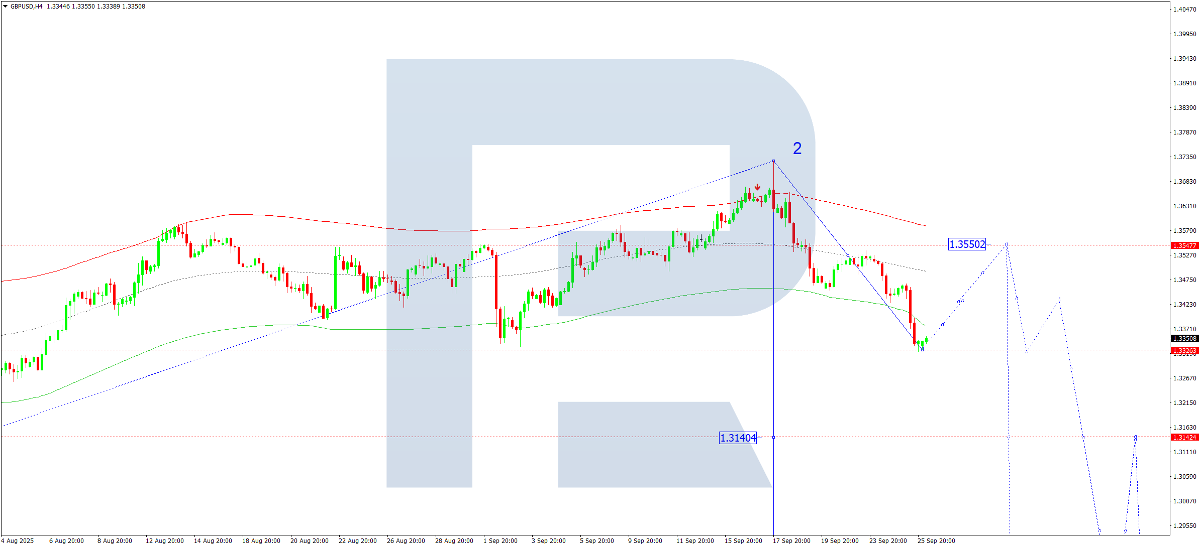 On the H4 chart of GBPUSD, the market completed a local downward wave to 1.3326. Today, 26 September 2025, consolidation has formed above this level. A breakout upwards may trigger a correction to 1.3430, with the possibility of extending to 1.3550. Afterwards, a move back down to 1.3326 is expected. If this level is broken, the downward trend may continue to 1.3140 as a local estimated target.